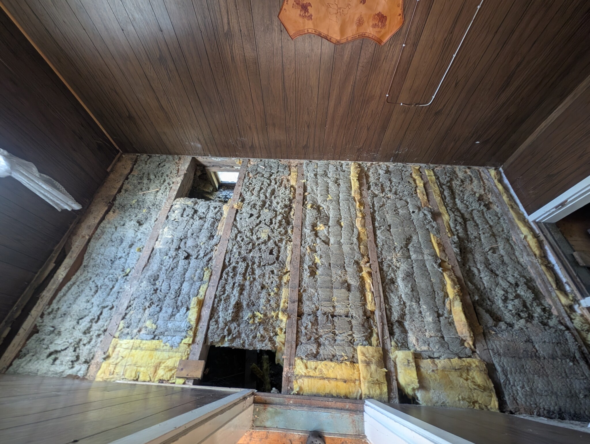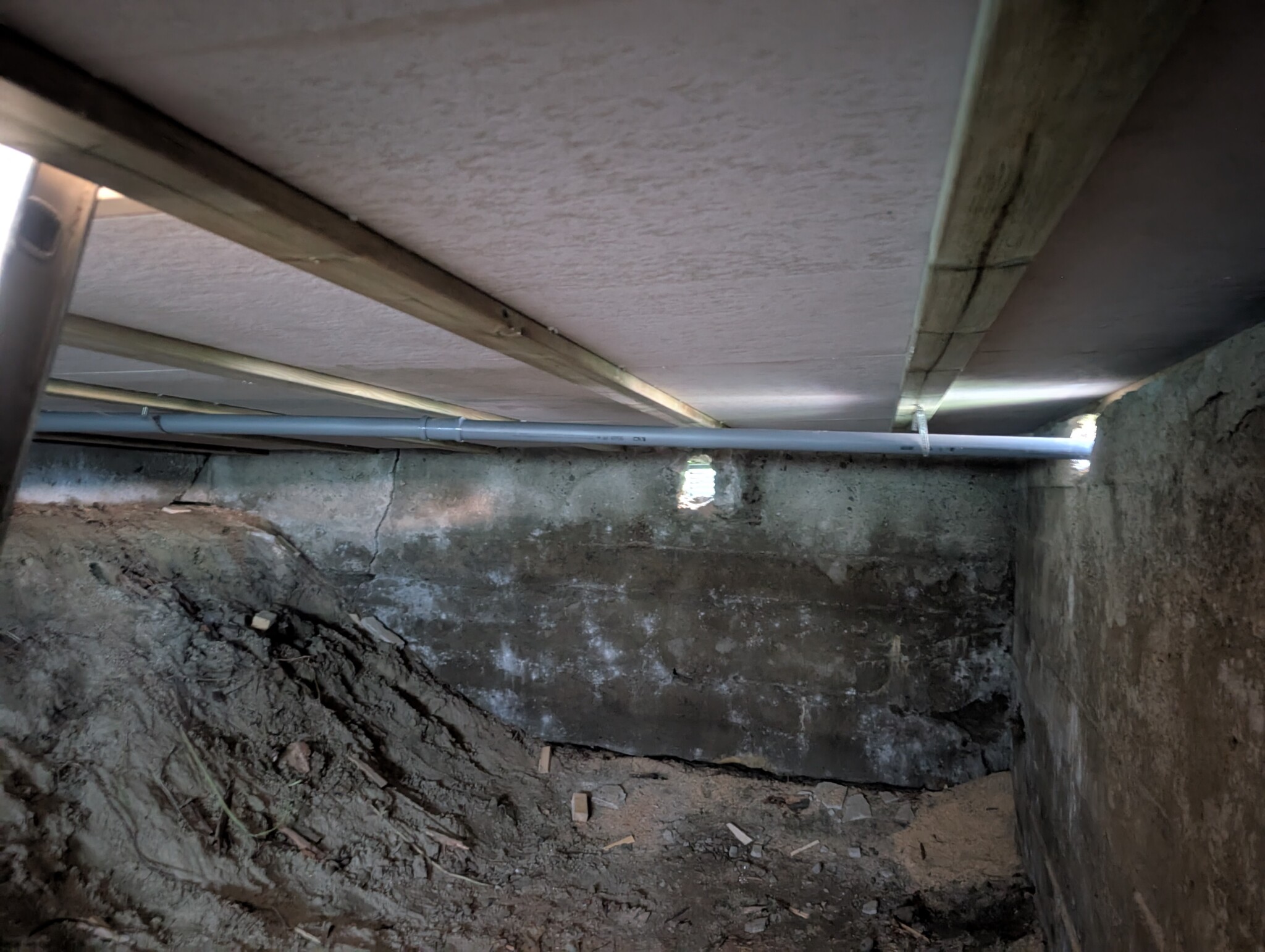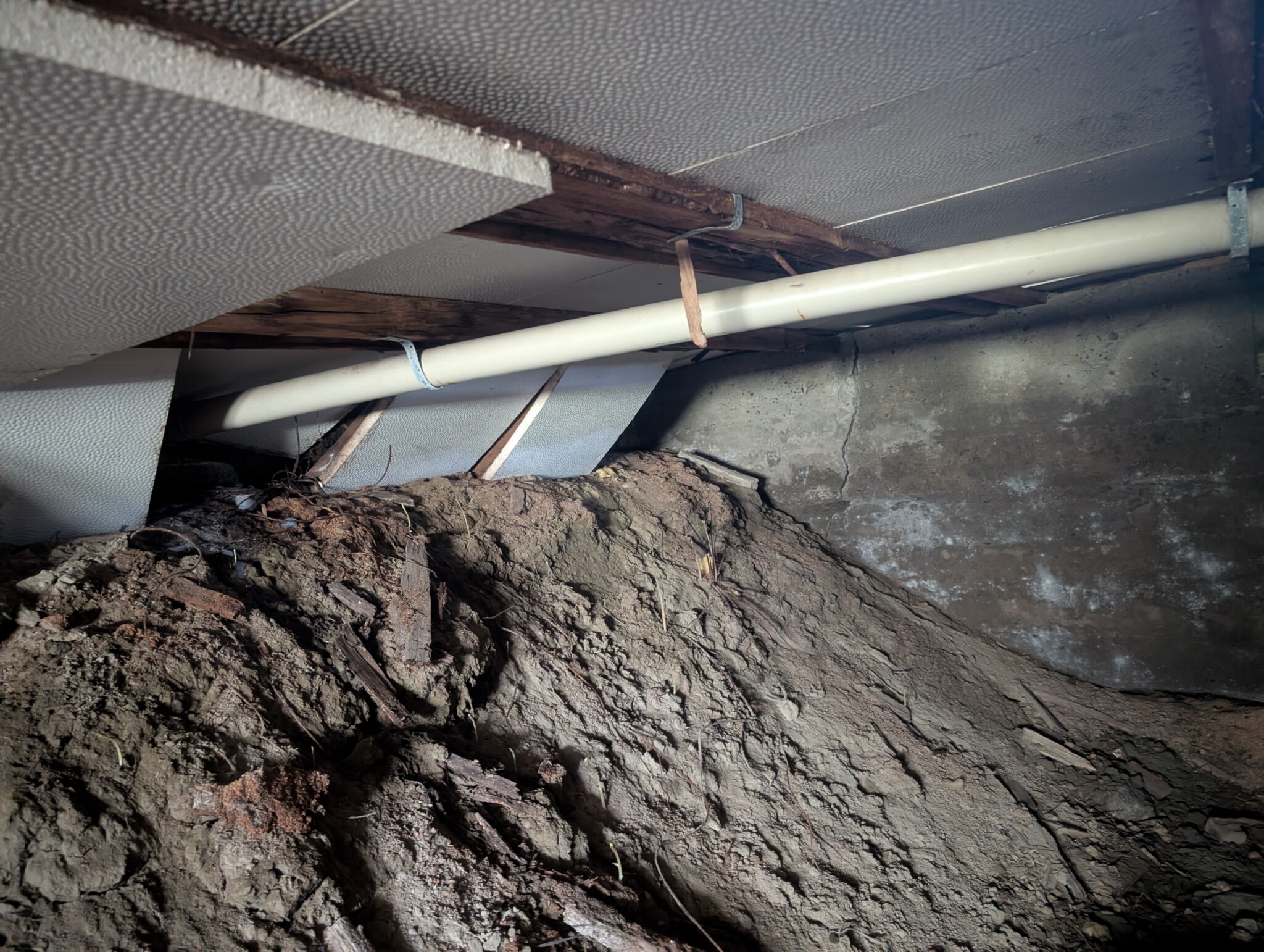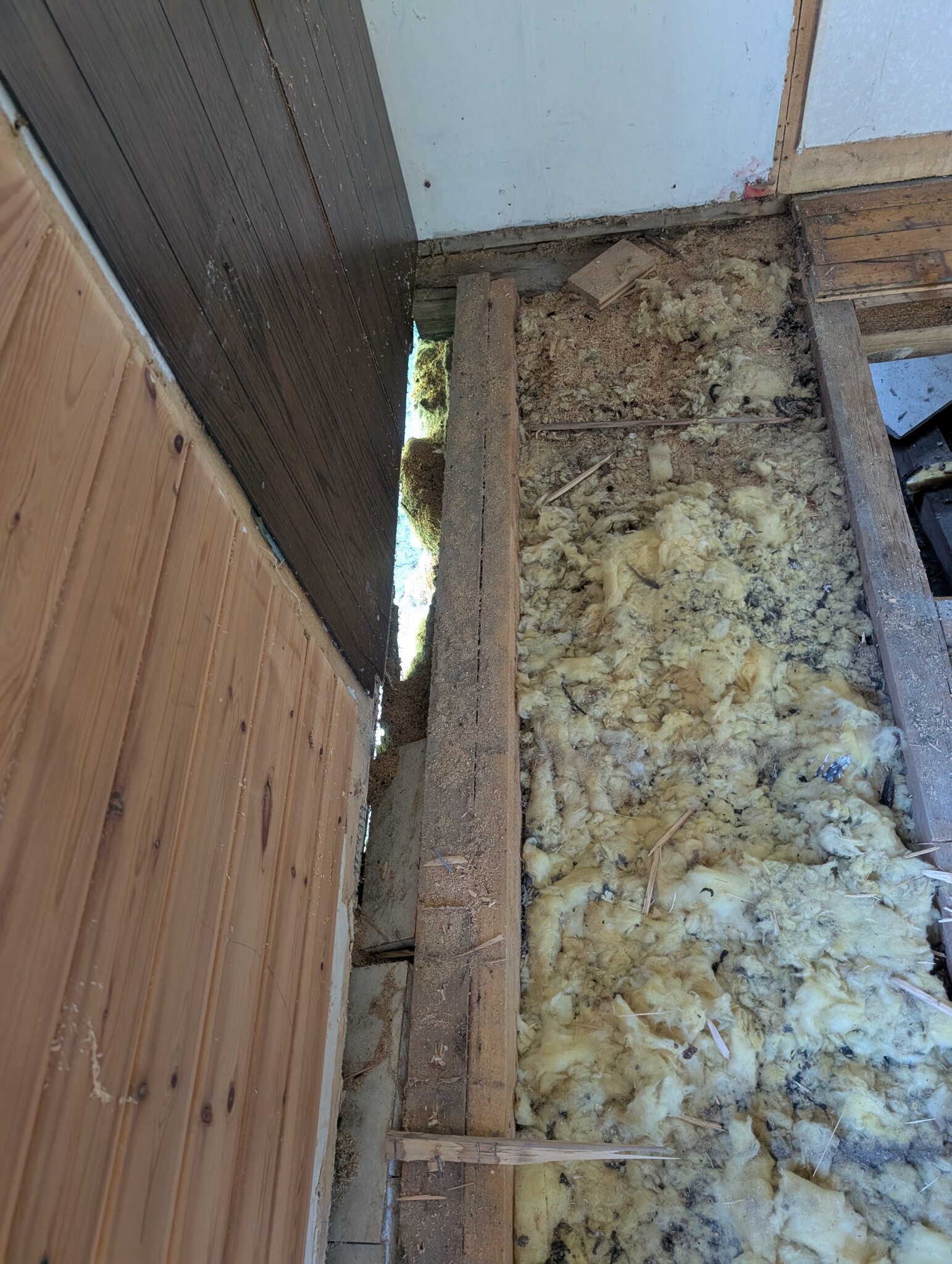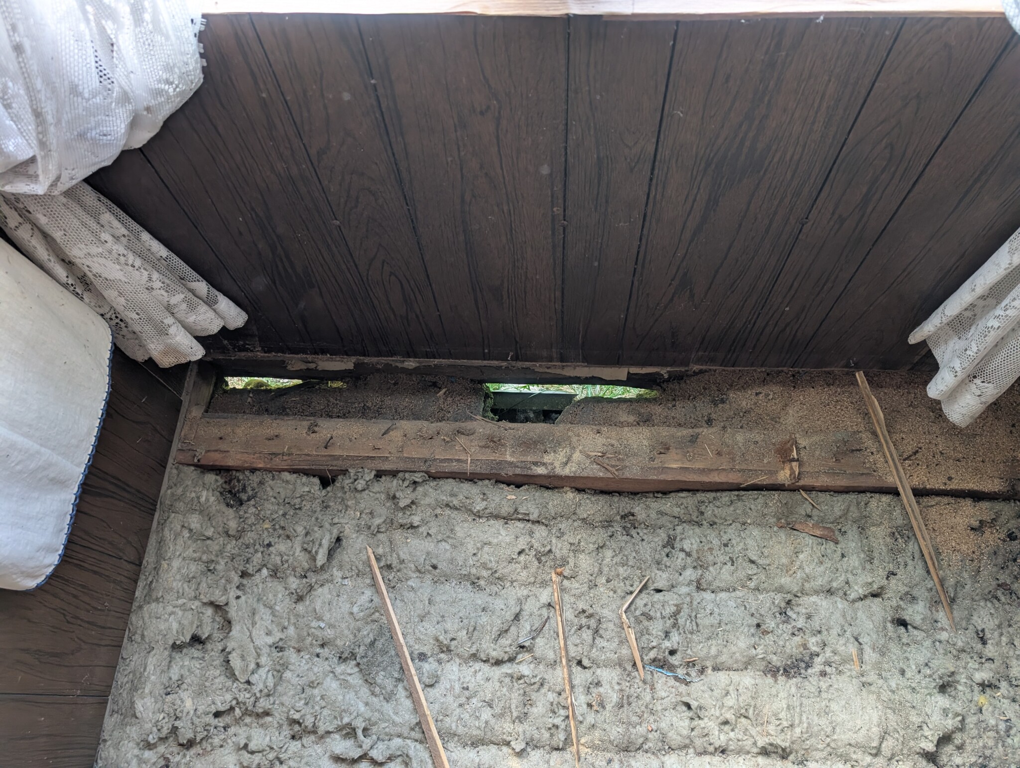 Att huset har satt sig är klart men det är inte bara det som är problemet. Huset står inte längre på husgrunden i framkant. Om det är huset eller grunden som har flyttat sig låter jag vara osagt. Tydligt att det varit mycket möss i isoleringen också.