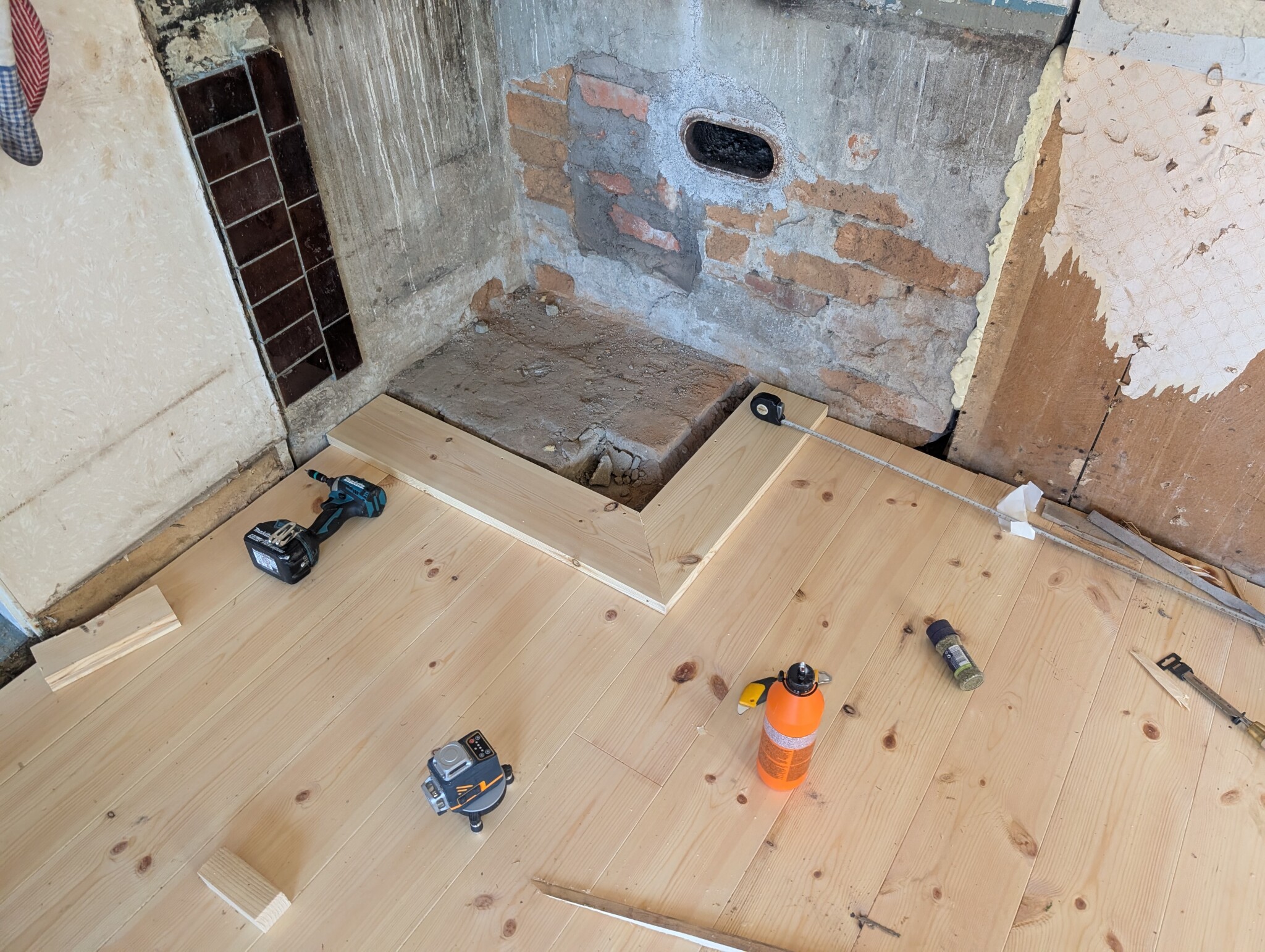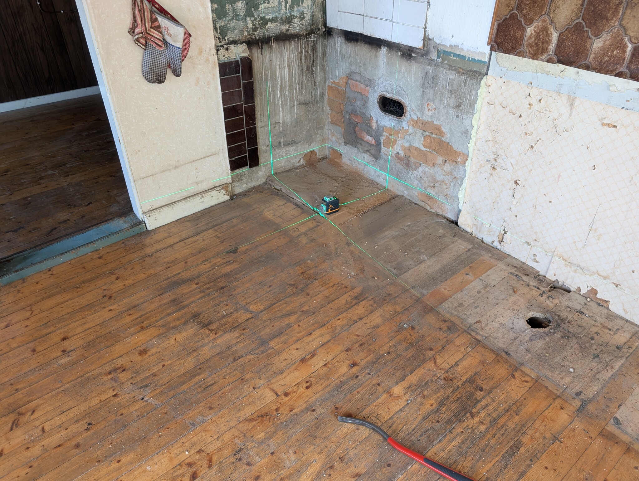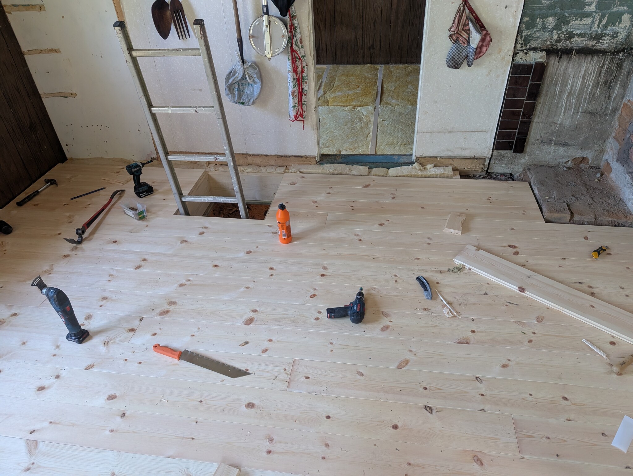 Nu är jag hemkommen igen efter en intensiv arbetsvecka. Golvet är lagt, vedspisen är åter på plats och några bättre begagnade köksskåp Har fått ersätta dom gamla slitna.