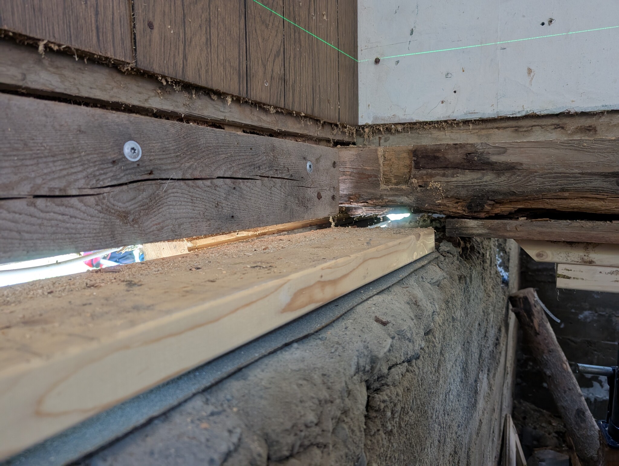 Det vi märkte när vi lyfte huset var att bärlinan mitt i huset i stort sett bär hela ytterväggen. Så det vi gjort är att förstärka den genom att sätta reglar på vardera sidan och sen lagt en nu syll på grundmuren som bärlinan ligger på. Regeln närmast ytterväggen ligger också dikt an mot nya och gamla syllen. Det känns väldigt stabilt så jag hoppas det också är det 😅.