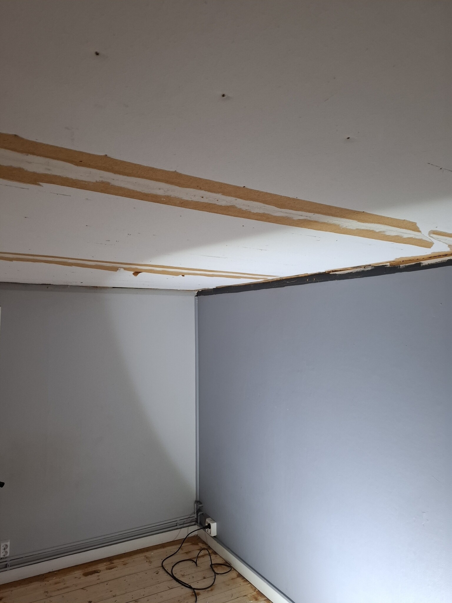 Hur återställer jag enklast och billigast takets utseende (hyfsat slätt)? Bredspackla och slipa känns knepigt, och kommer spacklat att sitta kvar? Renoveringstapet i taket?
