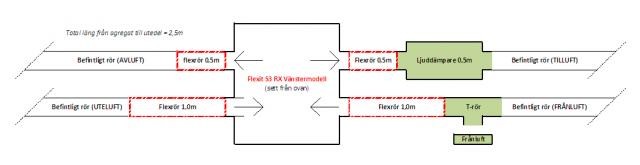 Och sen en grej till... hmmm... varför har du tre rör ut?!? Ska du ha separat spiskåpa med egen fläkt och sätta aggregatet i tex tvättstugan? Om inte så kopplas ju spiskåpan till anslutningen UNDER aggregatet. Den övre anslutningen lämnas då orörd. Aggregatet har ju en inbyggd by-pass för luftflödet från spiskåpan eftersom det ej passerar växlaren.