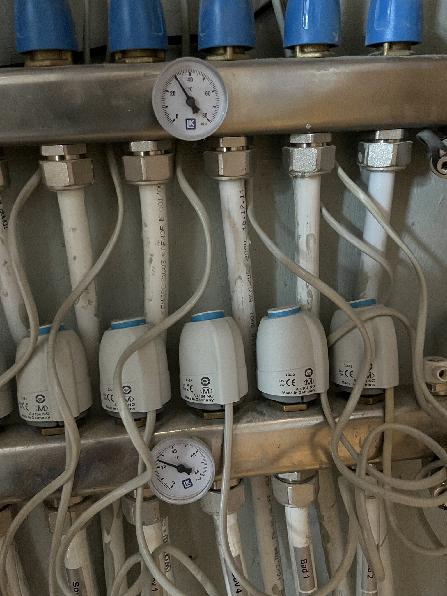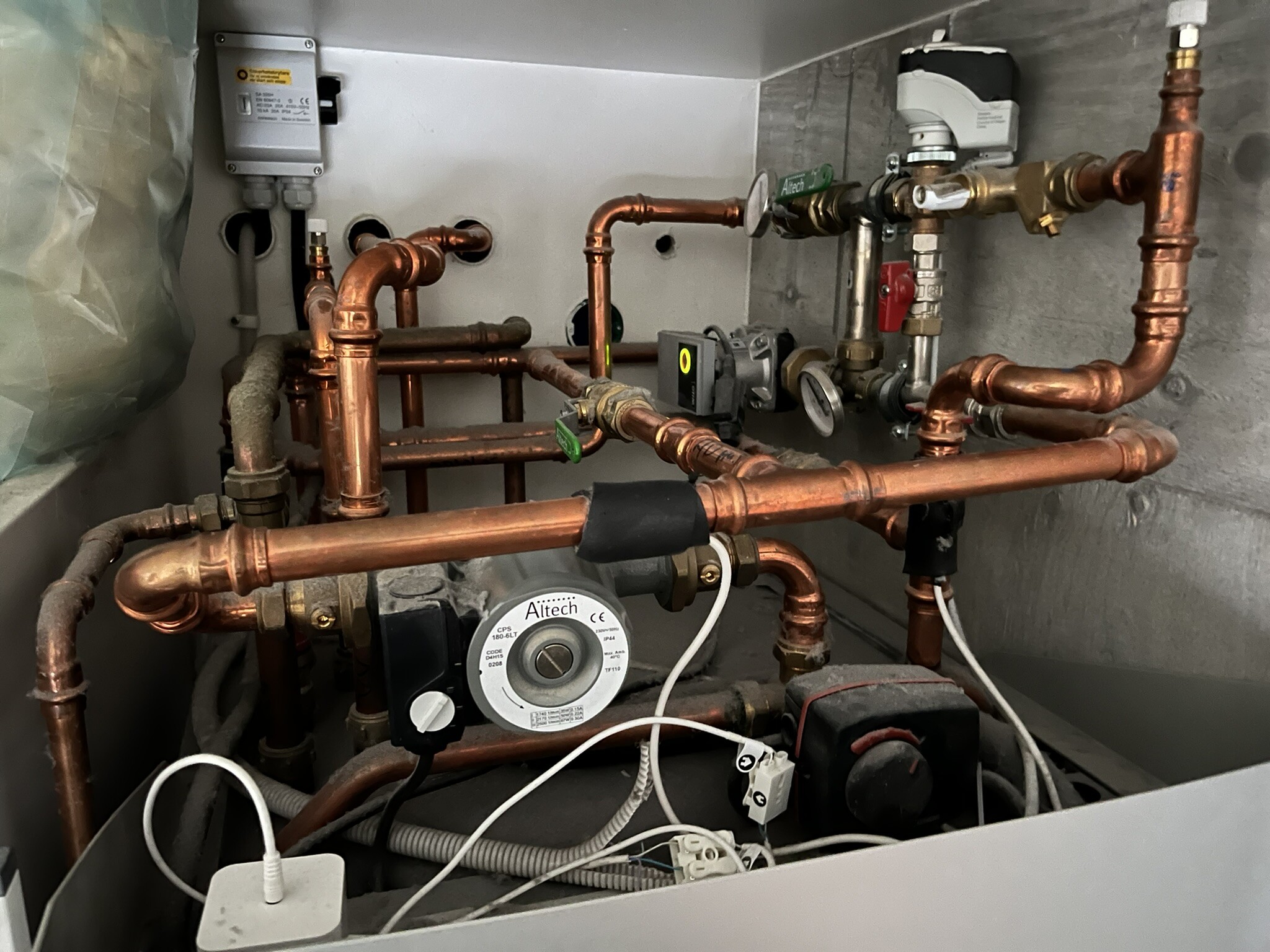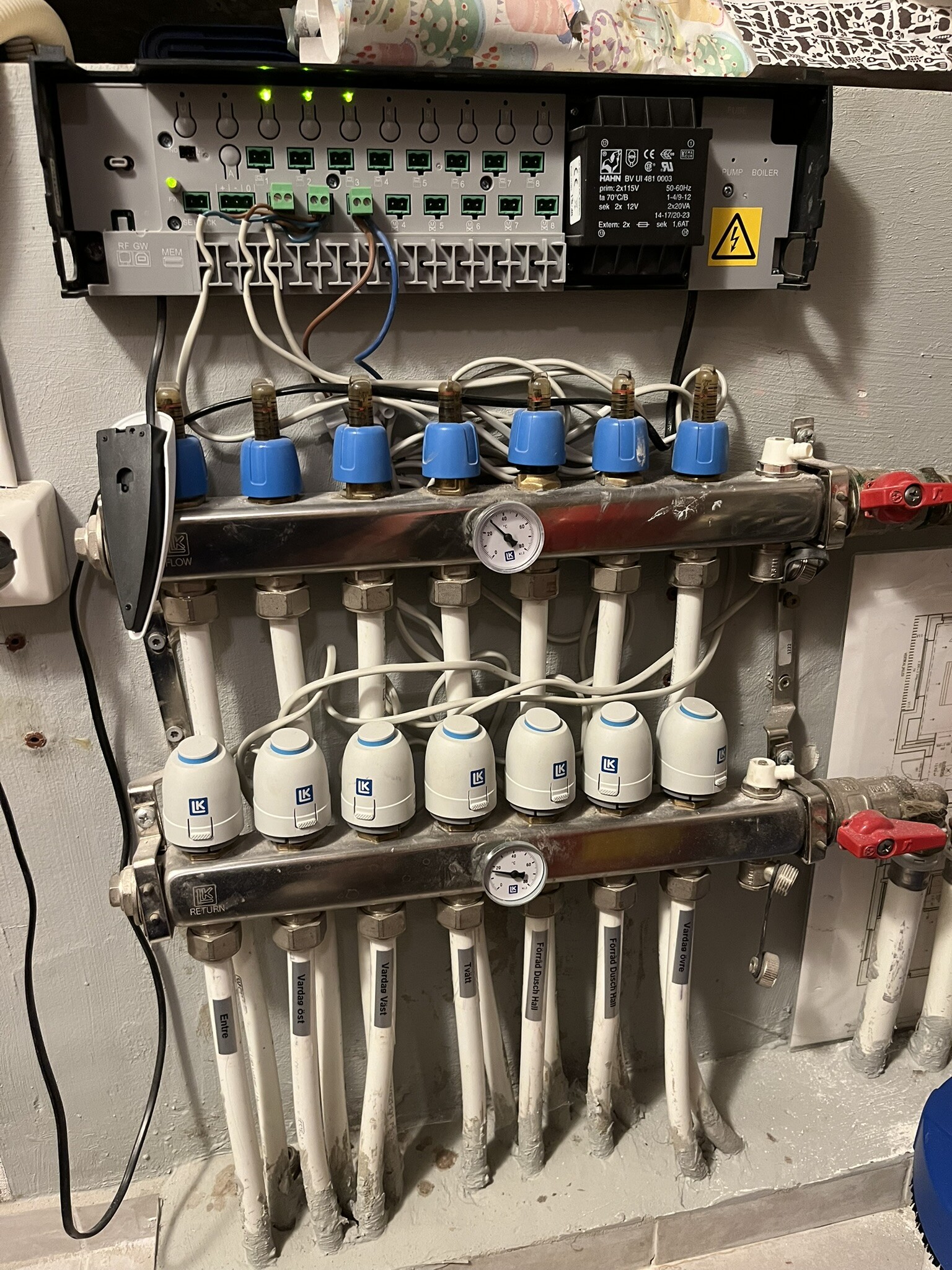 Nya fördelaren är kopplad mot bergvärmepumpens "radiatorslinga 1" som inte använts tidigare (tanken från början var att dra in radiatorer, men nu blev det grundlig renovering och golvvärme i den delen också).