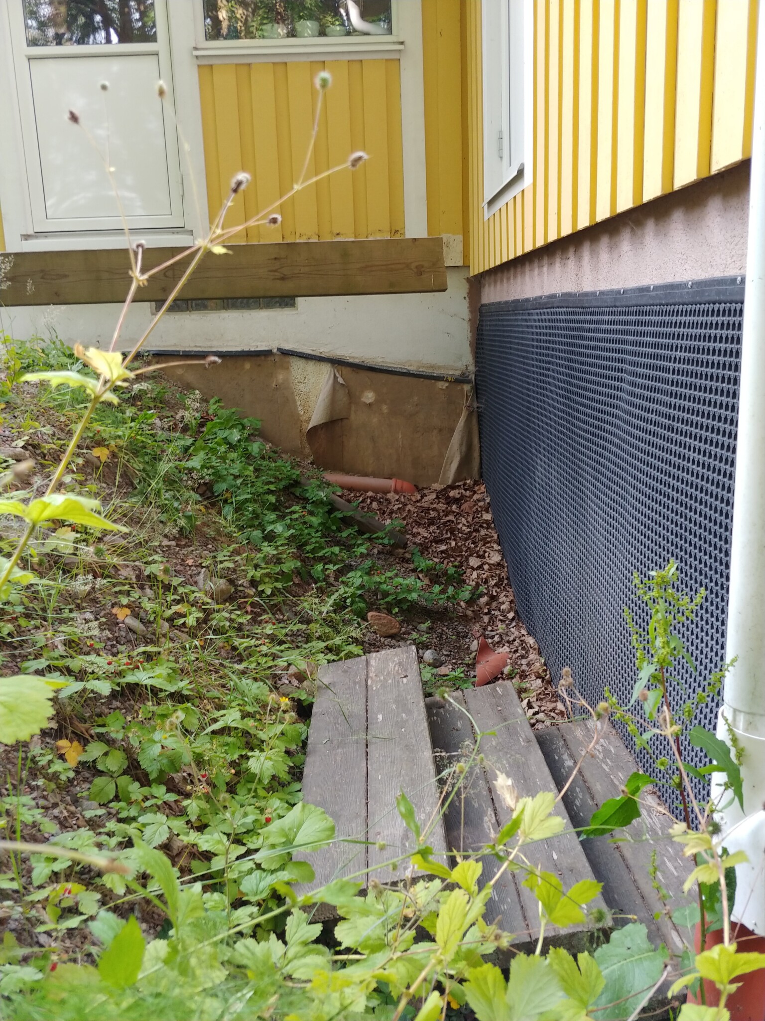För ett par år sedan byggde vi till huset (tillbyggnaden är det som syns till höger i bilden). På insidan av väggen (den som har svart platonmatta på sig) finns en matkällare som har ett fungerande klimat (mellan 7 - 17 ºC året om, <70% RH, aktivt avfuktad, ingen ventilation).