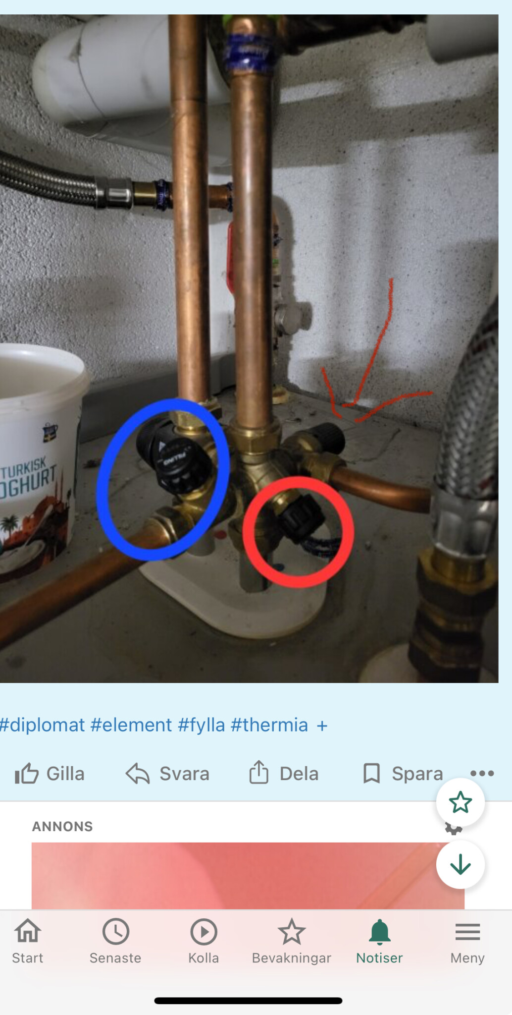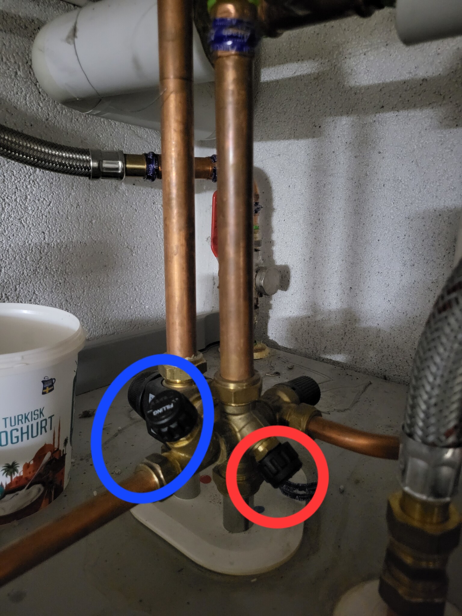 Hittade en ventil på ovansidan märkt filling (inringad blått på bild), men det händer ingenting på trycket när jag öppnar den. Ska jag öppna nån mer ventil på ovansidan? Ventilen inringad i rött är stängd och sitter som berget. Ut från ventilen i blått går röret till värmeslinga så det bör vara rätt.