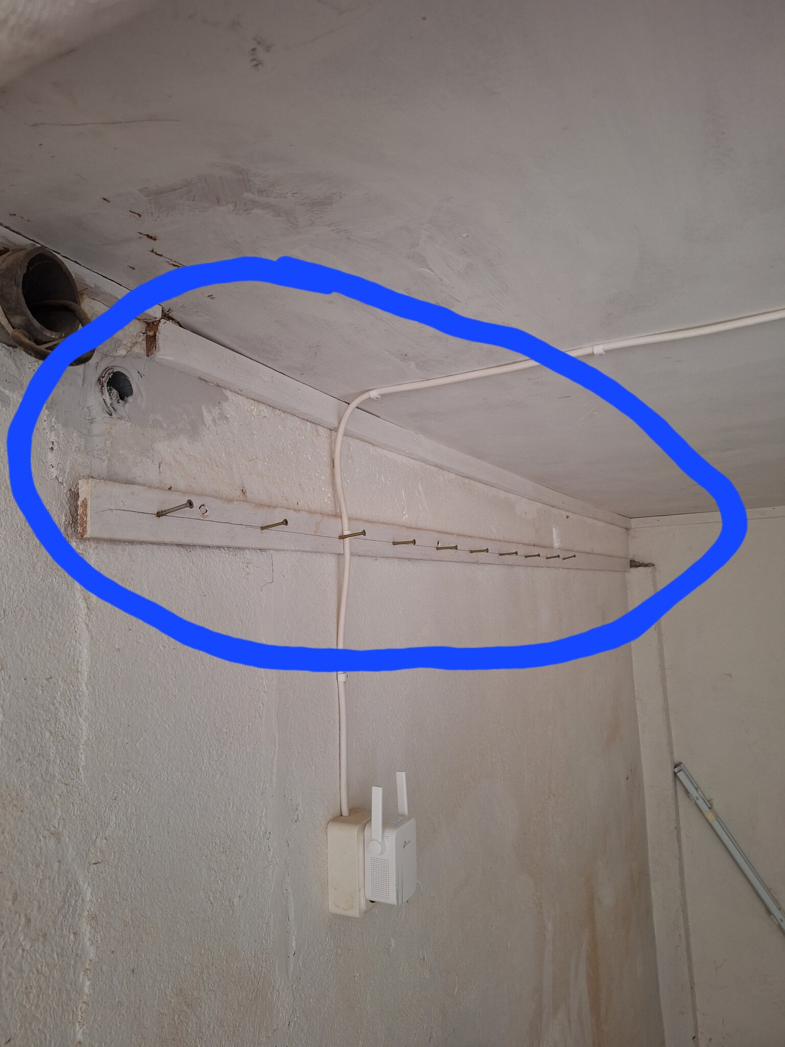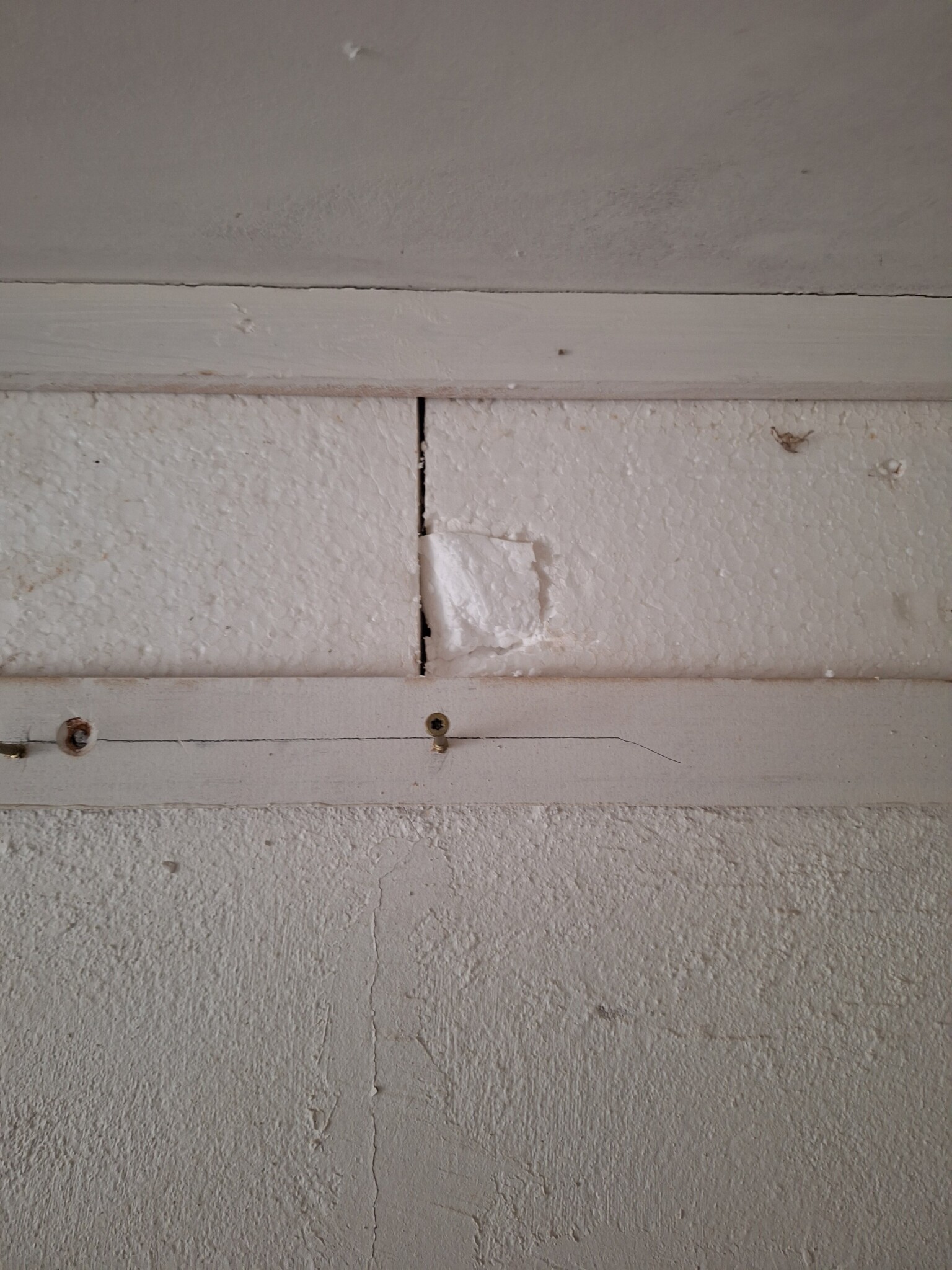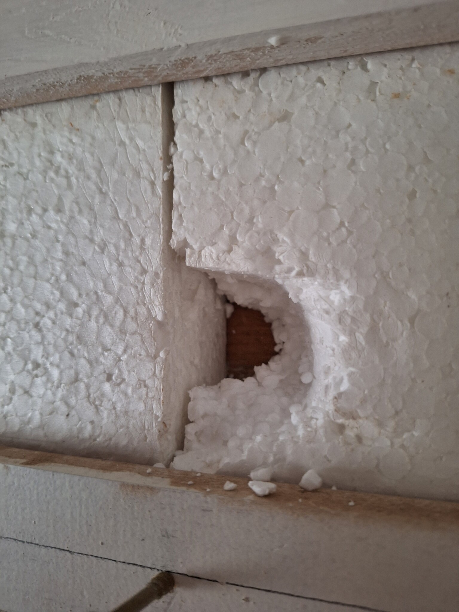 I ett källarrum har tidigare ägare satt upp en 2m lång 15cm hög frigolitskiva längst upp på en vägg. Det är yttervägg och det har både grävts, dränerats och kopplats bort oljepanna i rummet. Kanske därför det blev hål? Fråga mig inte..