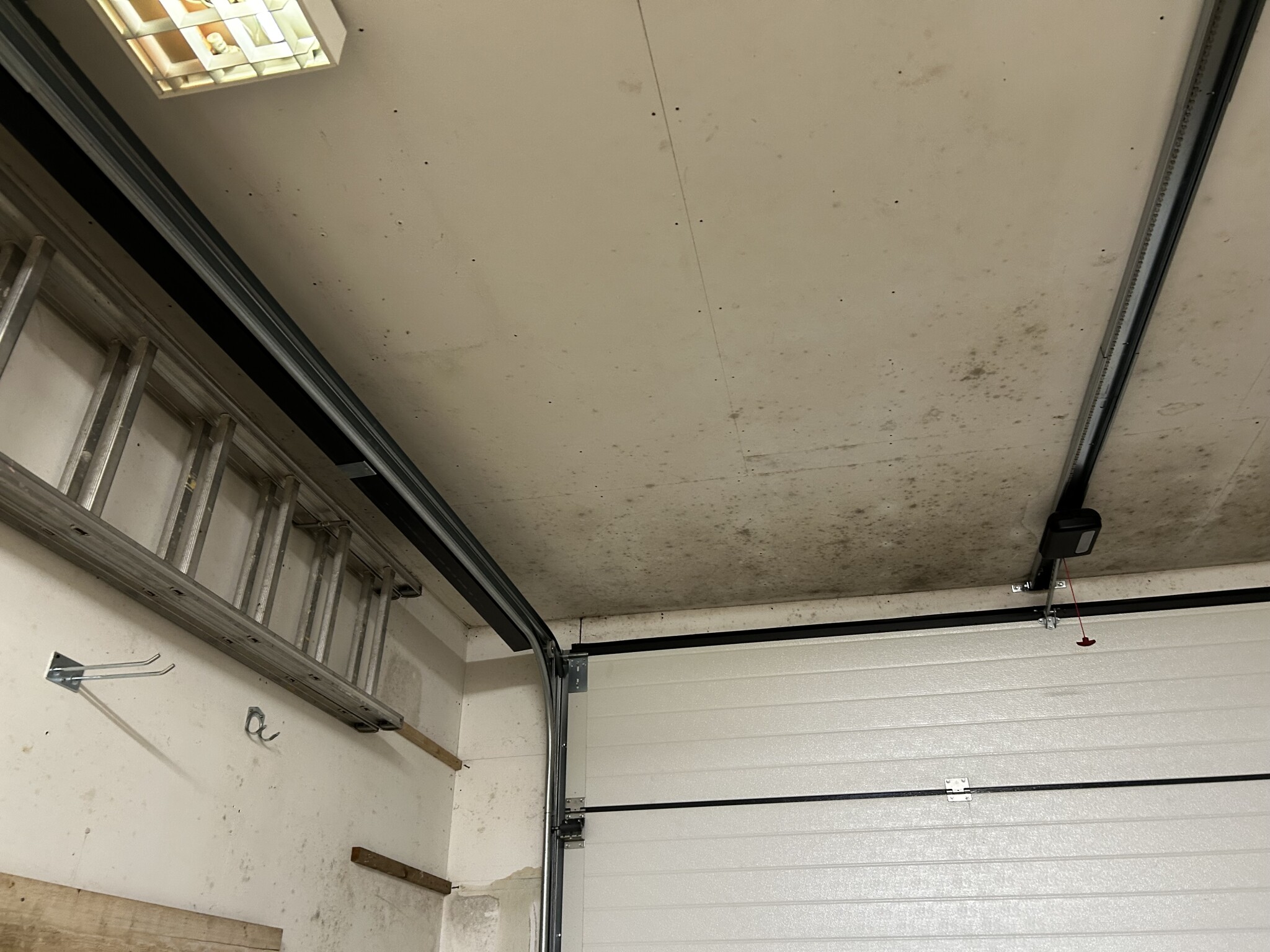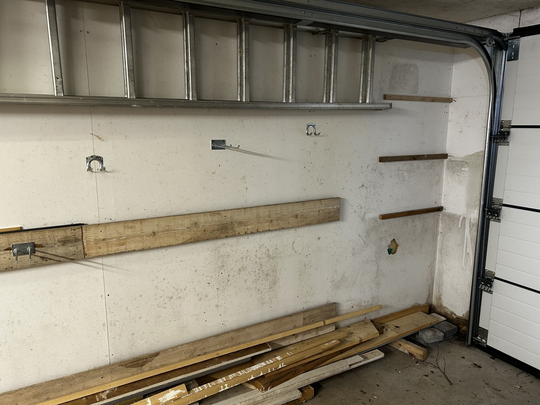 Sedan ser det ut på bilderna som att det läcker in vatten i väggarna runt garageporten. Syllen längst ner jämte porten är nästan garanterat fuktskadad, dvs rutten.