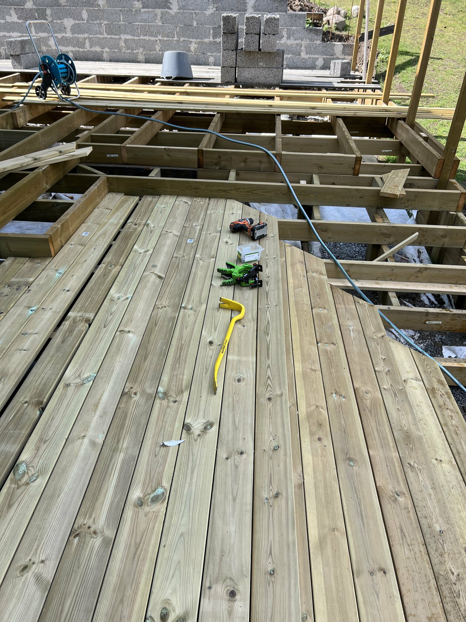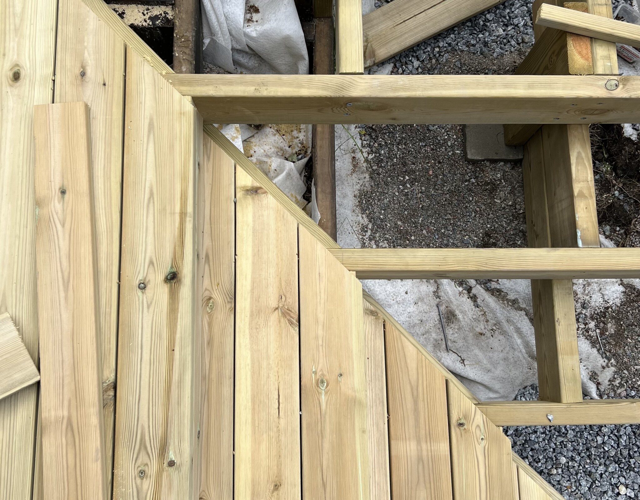 Jag har satt mig i en lite knepig situation när jag bygger trappa som delvis är tillhör trappa till entrén och sedan går i hop med trappa som leder till nivåskillnad i trallen. Nu använder jag en gammal grund från tidigare bygge som inte är helt i linje tyvärr så trappstegen har en vinkel strax under 90 grader. Se bilder. Jag tvingades av olika anledningar (livet med småbarn) sätta fast brädorna som leder till entretrappan och måste nu få till snygga geringar mot redan sågade brädor.