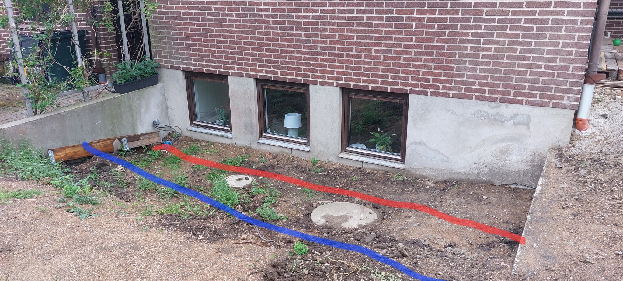 Killarna från dräneringfirman tyckte att vi borde bygga muren på den röda linjen. Dom menade att det blev för stor yta annars där det kunde samlas vatten på vid skyfall och att det då lätt skulle kunna rinna in.