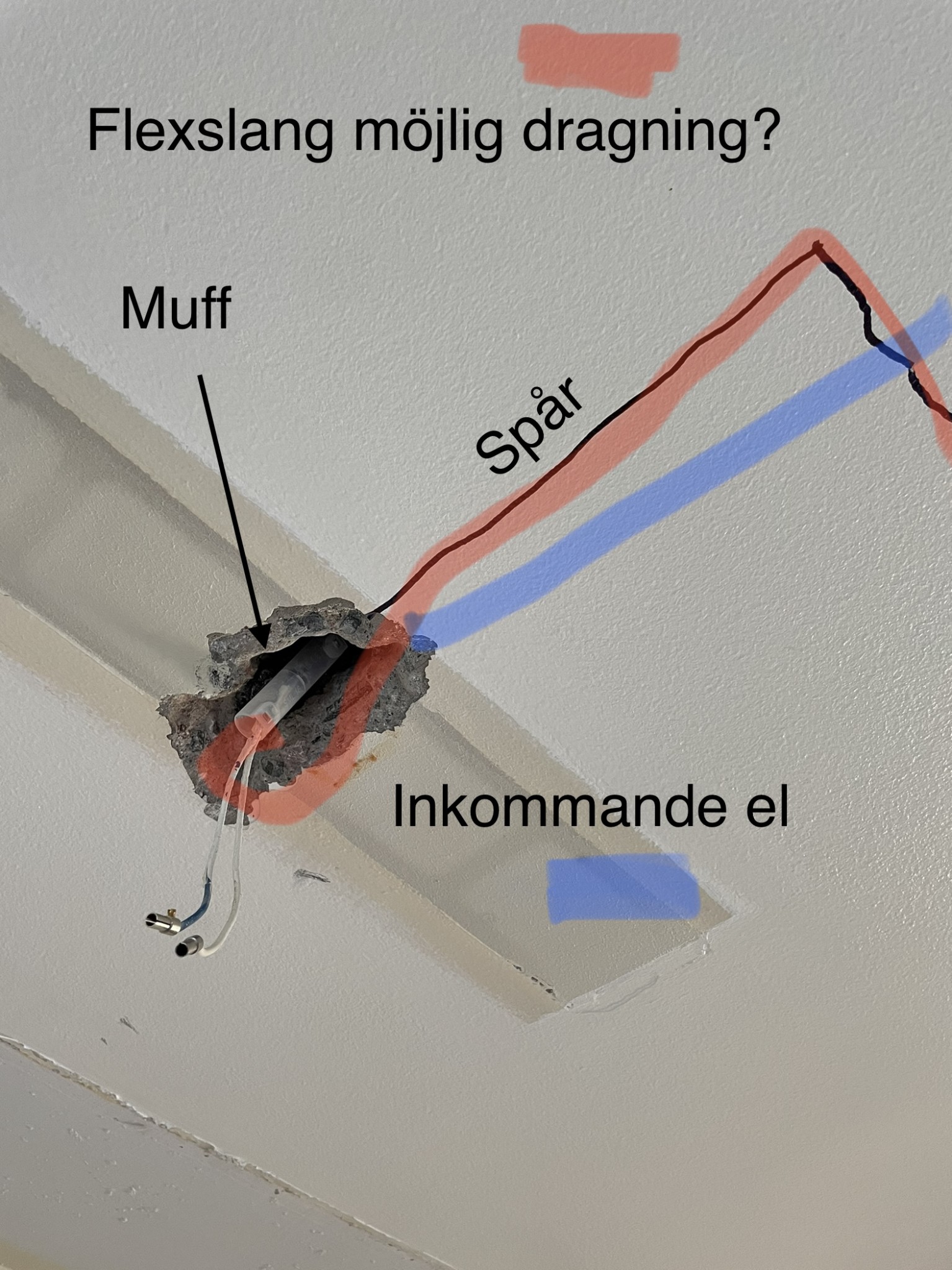 Min fråga är hur elektrikern drar flexslang från detta gamla lamputtag? Befintliga elen ligger ingjutet i bjälklaget och när jag trär på ”muffen” måste flesslangen läggas ”böjd” för att komma till spåret. Är detta ok? Har försökt göra en beskrivande bild.