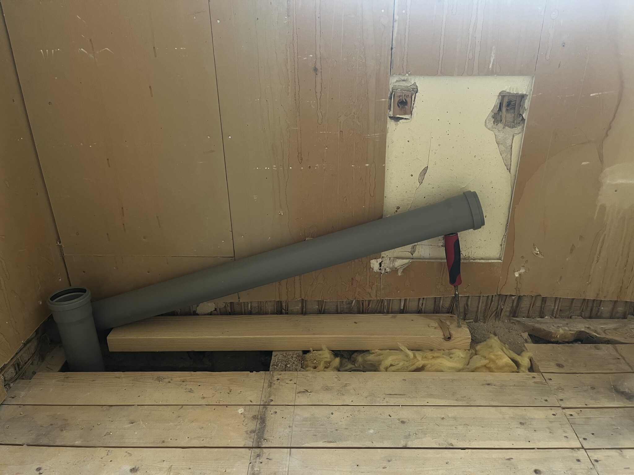 Här kommer avloppet upp (En ljus 95mm regel syns i bild mot den vägg som ska reglas ut):