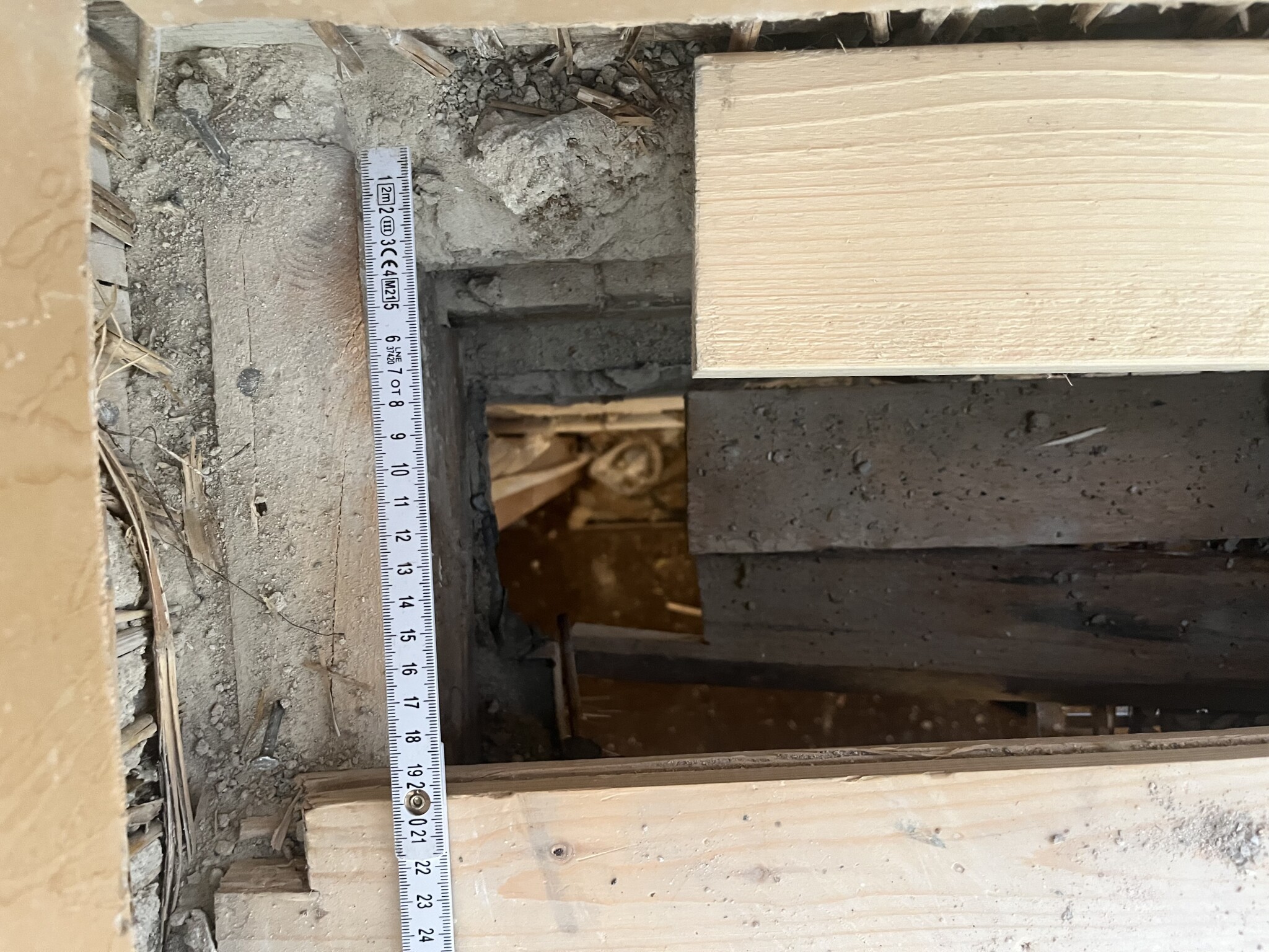Nu till min fundering: hur drar jag avloppet bäst? Då jag ska ha hörnskåp så vill jag komma så nära väggen som möjligt för att få så mycket av röret som möjligt innanför det som jag reglar ur. Jag vill också ha en vertikal anslutning (inga böjar) när jag väl kommit igenom mellanbjälklaget ner mot anslutningen i källaren. Det är ju som en liten klack nedanför väggen, så jag måste hitta bästa sätt att gå förbi den utan att bygga för mycket i ”bredd” in mot köket.