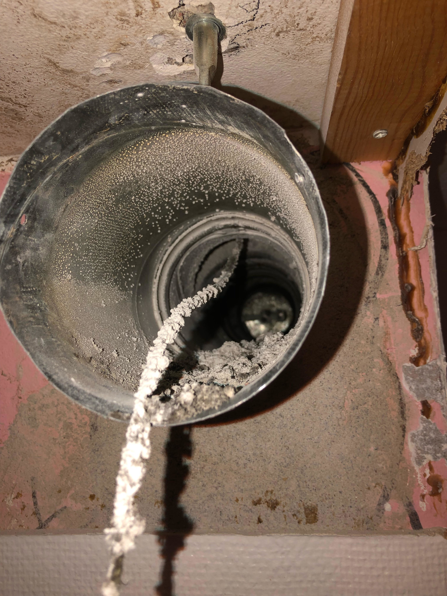 Ser ut som att man en gång i tiden har spacklat eller cementerat runt röret så min tanke är att jag sågar bort biten som sticker ut längs med väggen... Sedan trycker jag in en fästram med diameter 10 cm, typ: https://www.bauhaus.se/fresh-fastram-100