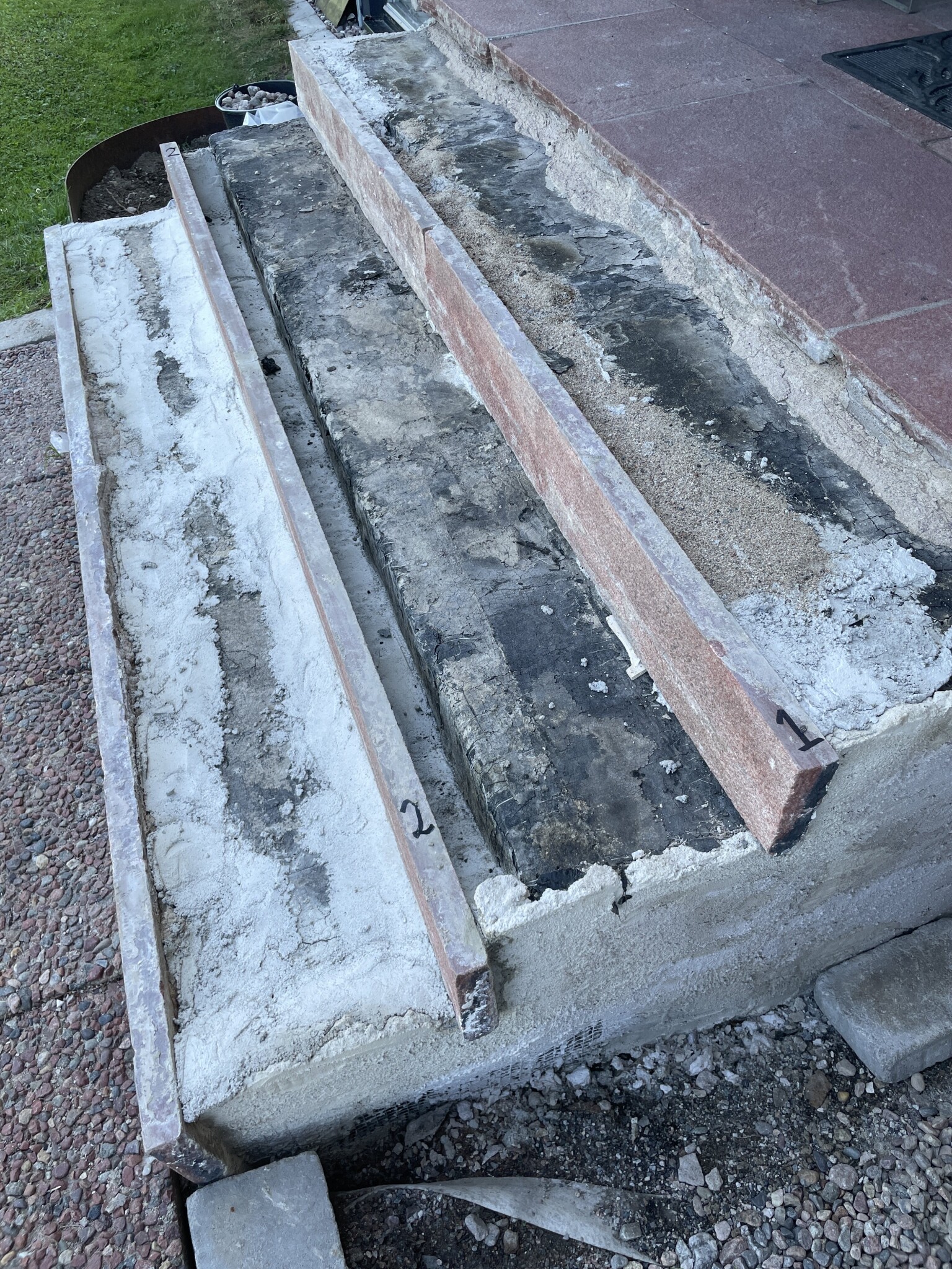 jag håller på att helrenovera entretrappan. Någon slags konstruktion av uppmurade lättbetongblock men ett ytskickt av tjärpapp. Ovanpå tjärpappen har man använt sand och betong. Överst ligger granitblock som jag så småningom ska sätta tillbaka.