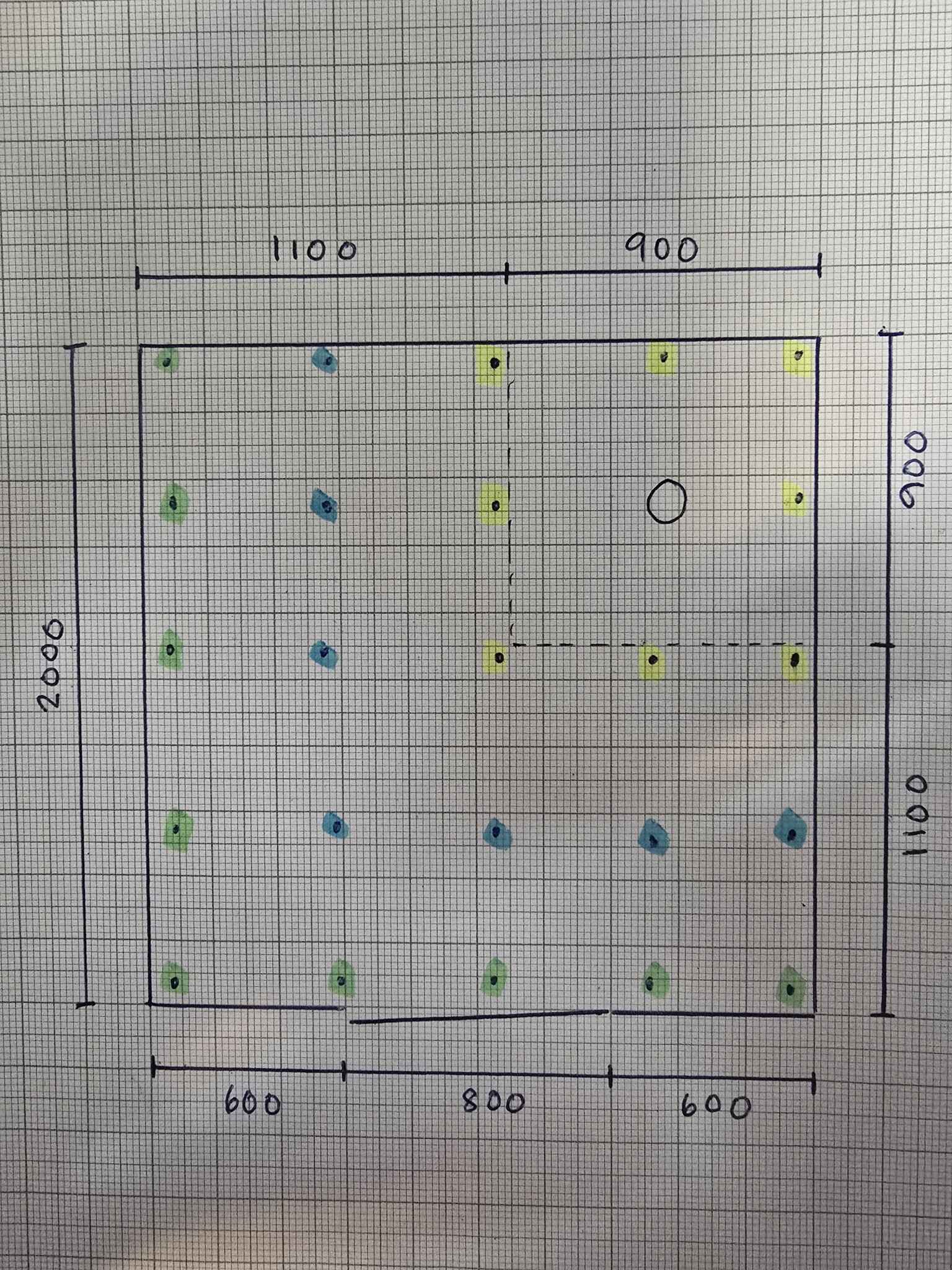 Sen utgår jag från dessa och sätter en rad typ 450 utanför dessa och sen vidare utanför den raden med en ny och för varje rad ser man till så man ökar nivån med vad man vill beroende på storlek av plattor och behov av fall.