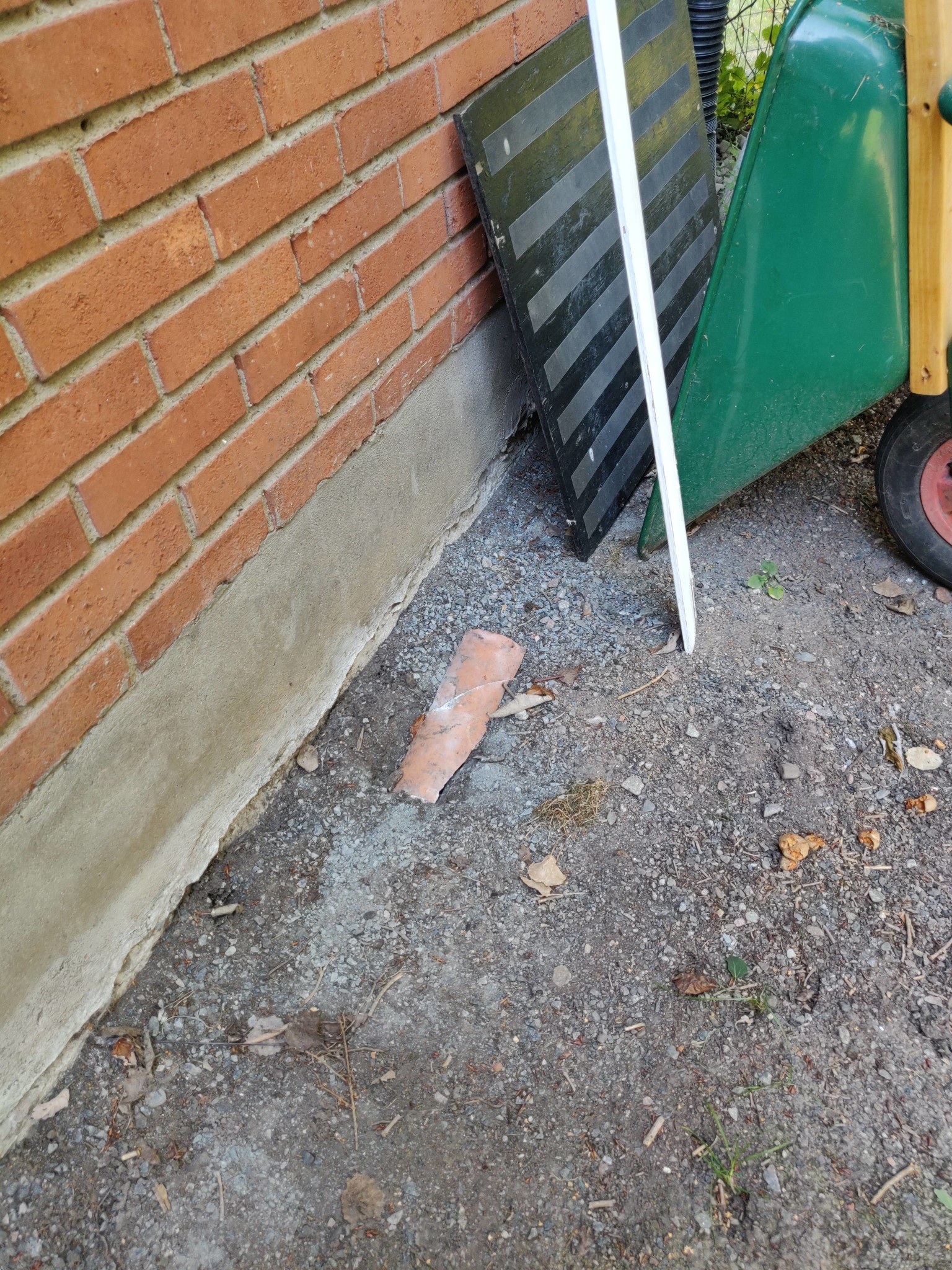 Jag målade ett fönster utifrån och stegens ena ben knäckte ett rör utefter husväggen. Se bilder. Det är nåt slags tegelmaterial.