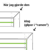 jag har satt en "ram" runt min altan (svart linje). När jag byggde altan så blev vinklarna rent ut sagt perfekta. Nu efter tre veckor så har de torkat ihop och det är fula glipor i mina 45graders geringar. (grön pil)