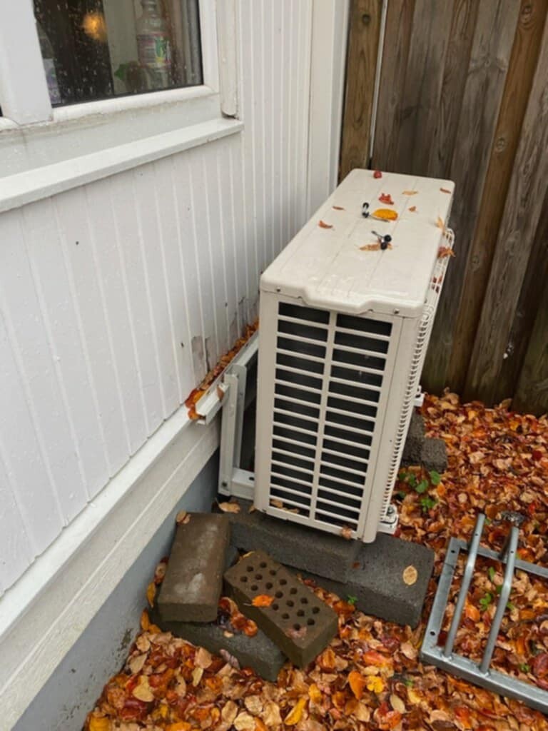 Hur gör vi när en luftvärmepump ramlat ner från väggen.