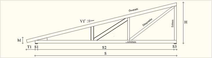 Tittar man på spännvidden så är en pulpettakstol i fackverk med vanligt konstruktionsvirke fullt möjlig. Det som krånglar till det lite är att den ska kraga ut 80 cm utanför det yttre upplaget och därmed drar på sig ett litet vridmoment som kräver en viss balkhöjd över upplaget. Detta förhållande plus önskemålet om 7 graders taklutning ger en förhållandevis hög höjd längst in. Ett alternativ till fackverk är en pulpetformat limträbalk. Vad som blir billigast i slutändan vet jag inte. Limträ brukar bli ca 3 gånger så dyrt som vanligt virke sett till volymen, men här tillkommer en hel del jobb. Sedan finns det ju en del andra aspekter också som kan påverka valet.