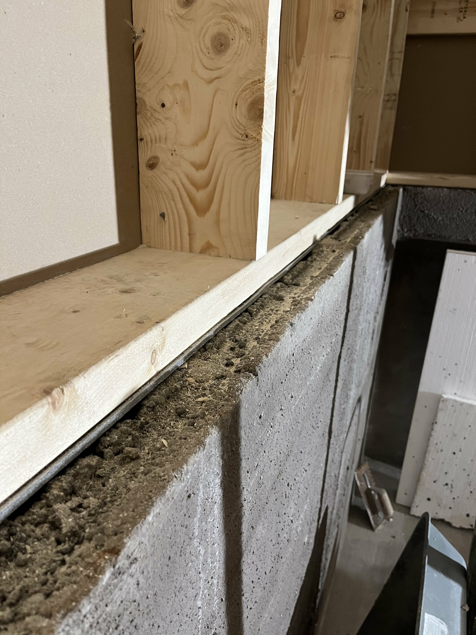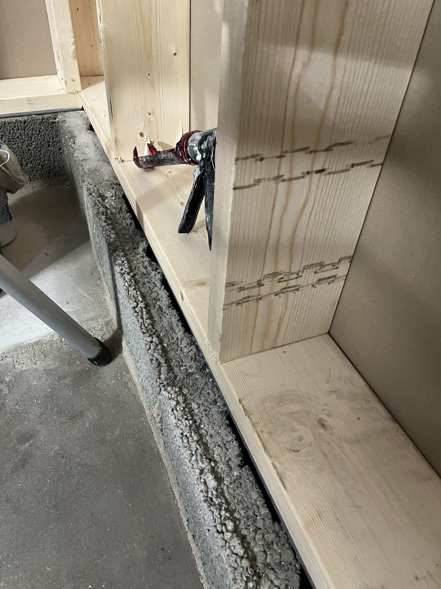 se bild. På stommen skall det efter isolering och ångbroms på en gles innan skivor som (installationsfack). Skivorna planeras att liva rätt ok med mur/sockel sedan.