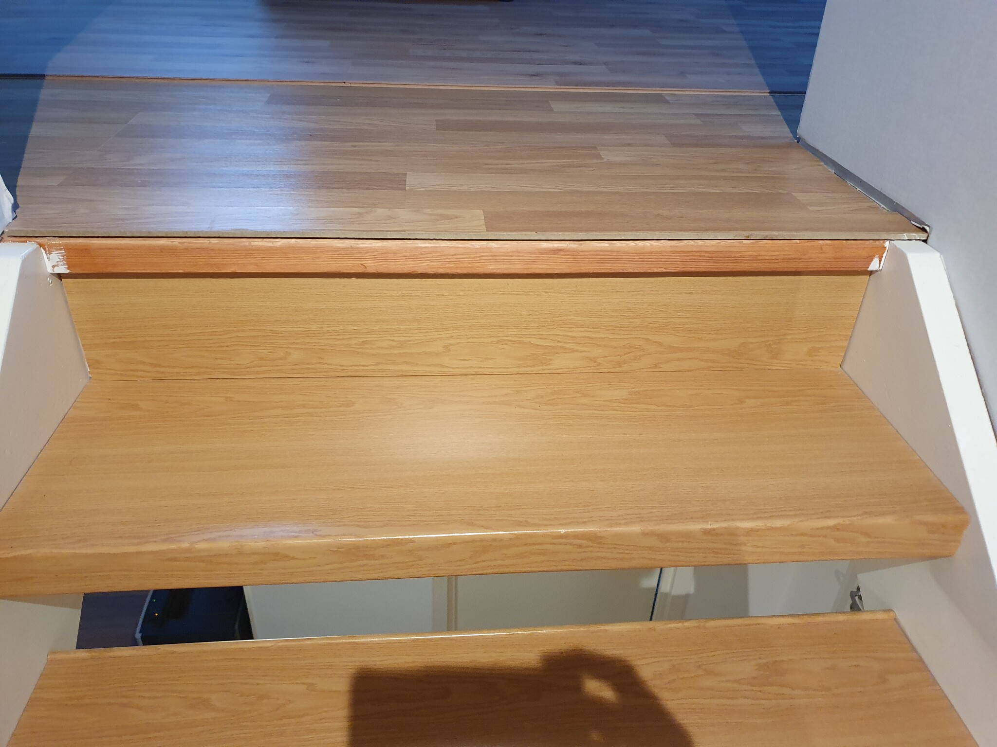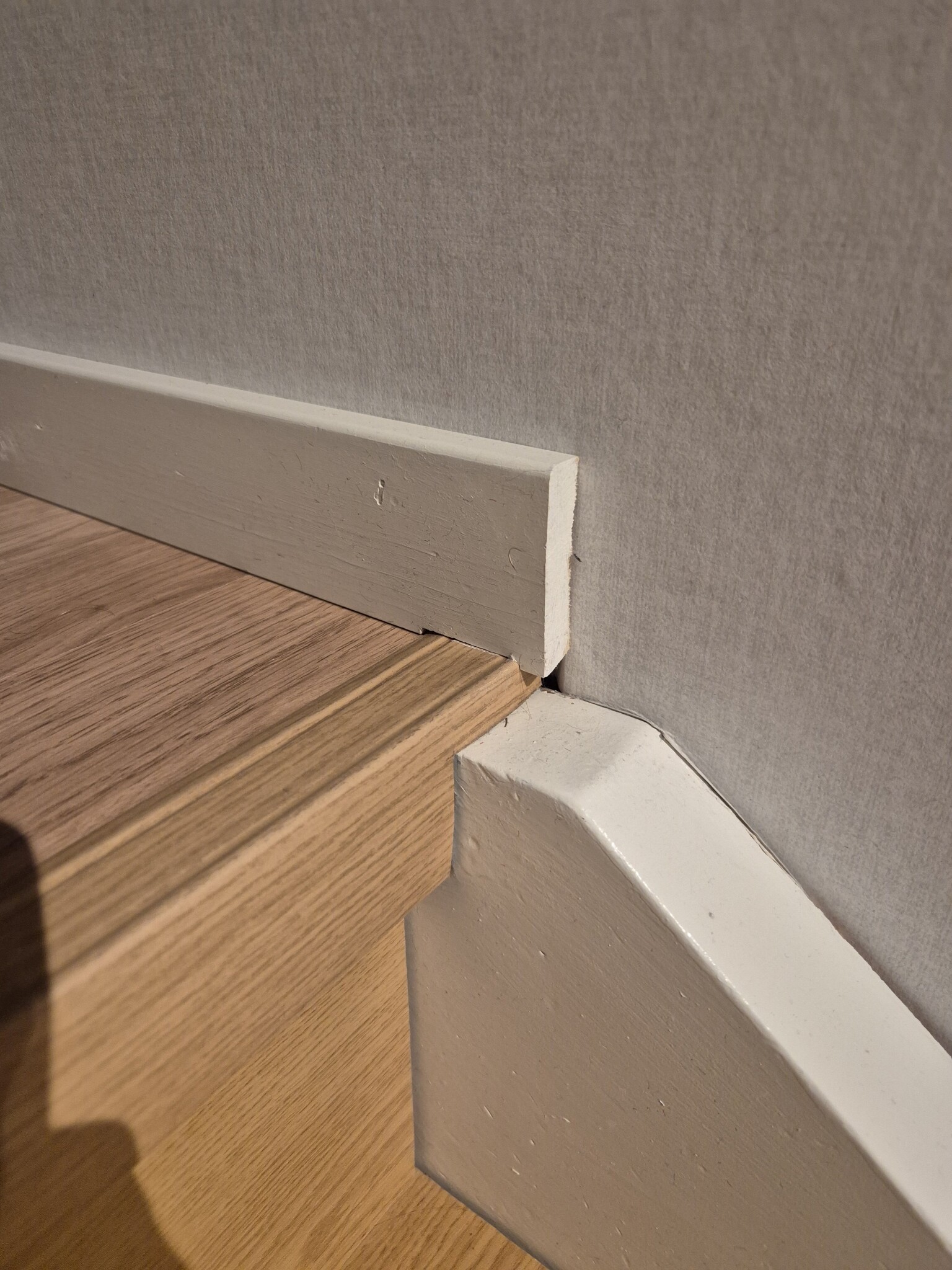 Vi har en trappa som sedan tidigare är fixad med Lundbergs trapprenovering (laminat). Vi håller nu på och lägger nytt golv på övervåningen, också laminat. Det jag har svår att få till på något snyggt sätt är själva anslutningen mellan trappan och golvet, dvs där själva golvet slutar. Vill ju helst inte ha alltför skumma listlösningar. Tänker någon typ av L-formad list, men har svårt att se att jag kan få till det så det ser snyggt ut nerifrån. Hur brukar man göra? Någon som har någon bra idé?