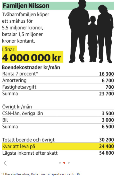 Det många gärna glömmer bort är att ränta på lån inte är en statisk siffra. När man planerar framåt, måste man även ta med situationer med kanske 8% eller 14% ränta ( har själv haft 14% ) och då fundera vad som händer. Att då kanske behöva flytta från sitt hus och ändå ha en del skulder kvar är ju inte någon trevlig situation. Jag tycker att jag och min familj gjorde det rätta, som köpte ett hus för 4 * vår gemensamma bruttoårsinkomst, levde lite knapert ett tag, men amorterade allt på 30 år ( var ett krav då). Idag har vi en bostad, som i kronor räknat är värd 10 ggr mer och fortfarande motsvarar c:a 8 årslöner, men boendekostnaden är ju liten ( = mindre än hälften av en något mindre hyreslägenhet kostar ). Om nu inflationen och därmed ränteläget, av någon anledning skulle dra iväg, så kommer det inte att påverka vår bostadssituation speciellt mycket och husets värde kommer ju troligen att följa inflationen någorlunda lika, om man räknar över en lite längre tid ( det kan ju bli ett stort pristapp, just när krisen kommer).