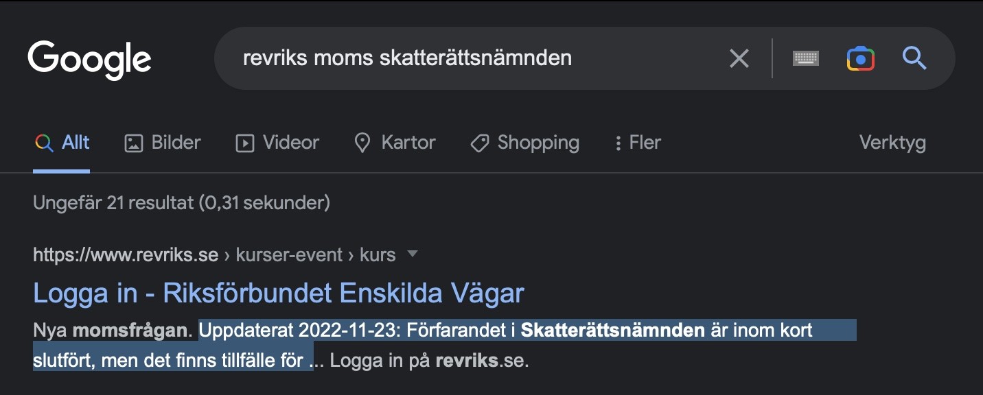 Lyfter min egen tråd, REV informerar idag att utfallet av prövningen drar ut på tiden, hur har ni som sitter i styrelse för en samfällighet agerat i momsfrågan?H Husgubbe skrev:Det står att läsa om på flera ställen bla skatteverket osv