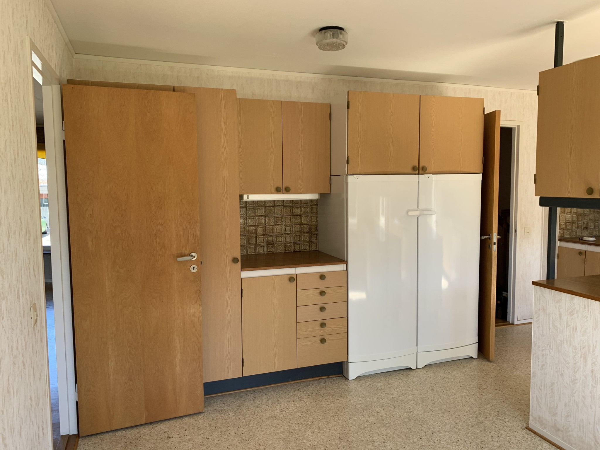 Men efter jag flyttat renoverade morsan och farsan. Tog ner väggen mellan kök och runda bordet. Satte en ö längs med rummet i köket med häll mitt emot kyl och frys och en högre sittdel mot det runda bordet till.