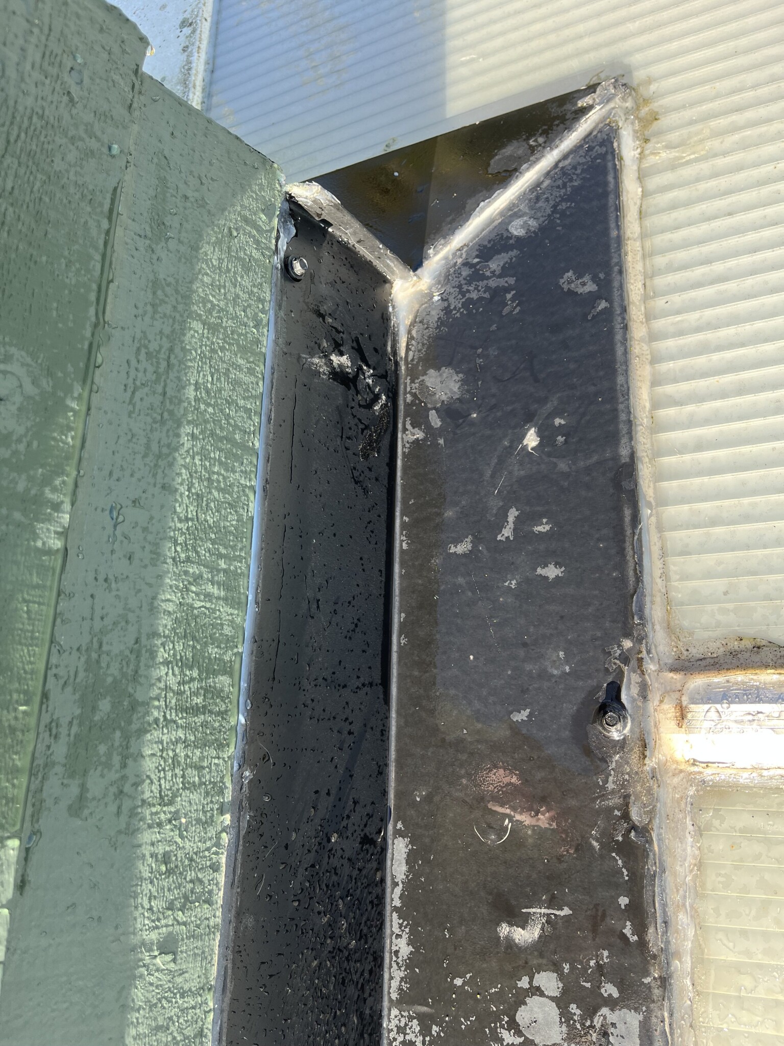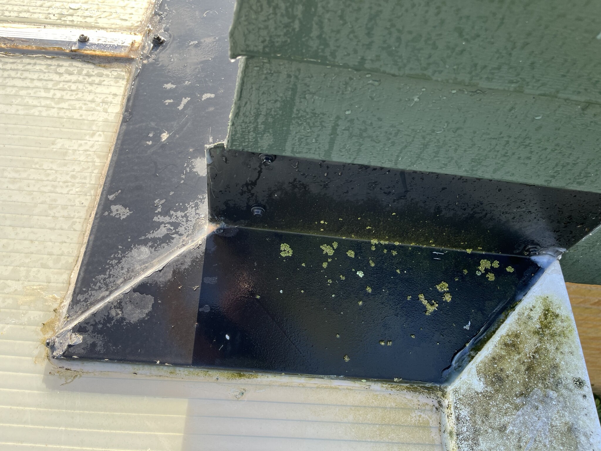 Läckaget är i ett hörn i anslutning till en tillbyggnad med en sarg av panel. Har tätat med silikon längs plåt och tak men trots det droppar det in i hörnet vid regn. Har lagt till några foto.