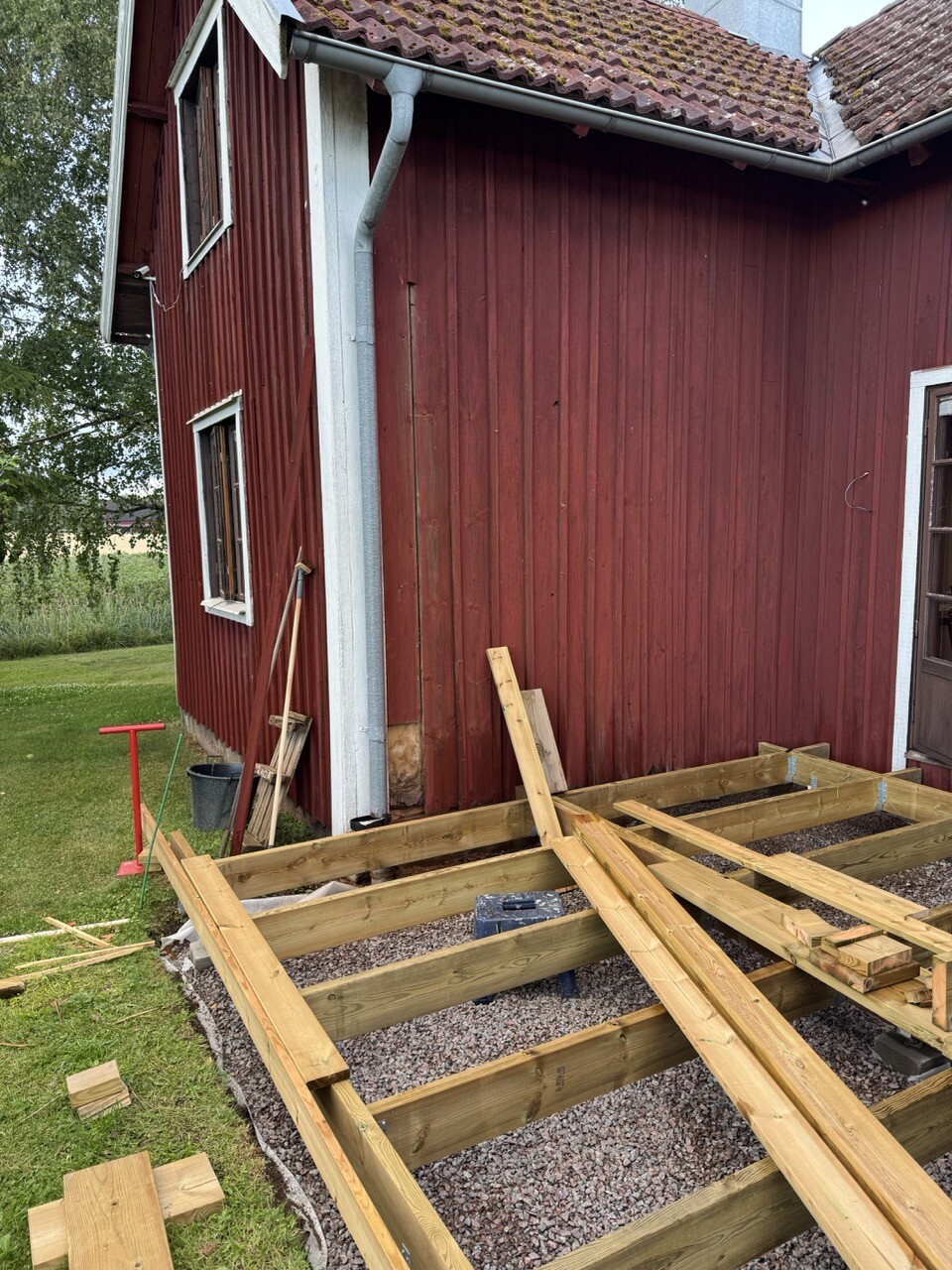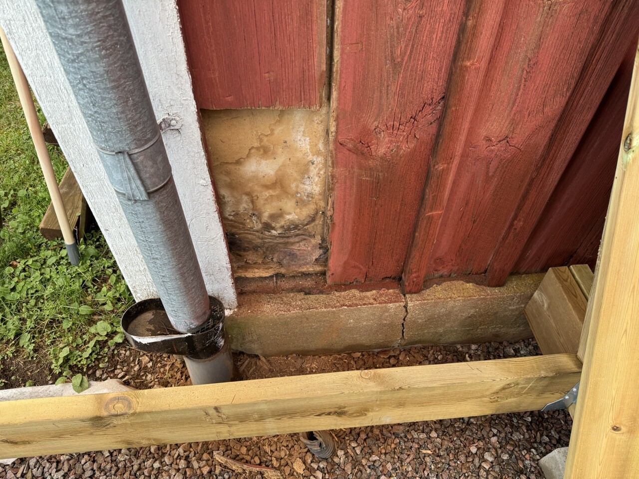 Håller på och bygger en altan och tänkte passa på att byta ut en väggpanel med hål i sig längst ner på huset. Men det verkar vara värre än jag trodde och den balken närmast sockeln ser inte så frisk ut. Min gissning varför detta har hänt är att renstratten för stupröret sitter precis bredvid och stänker vatten på den.