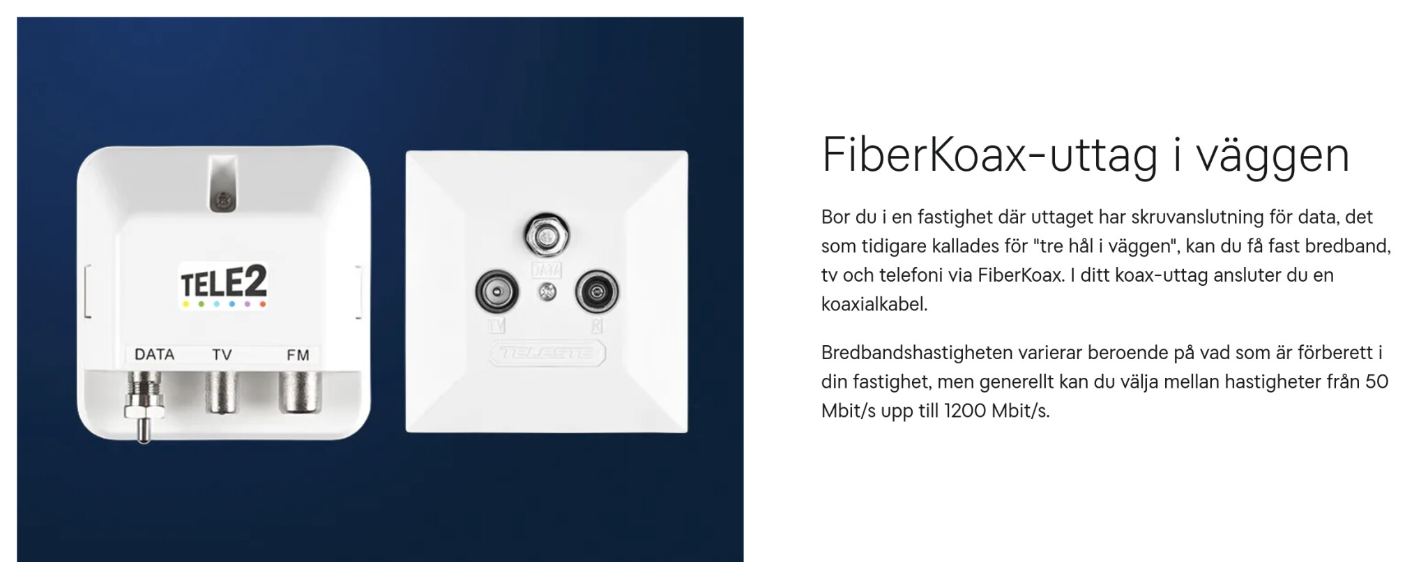 Och spridningsnät via koaxialkabel. Samma kabel och uttag som funnits i åtminstone 20 år. De gamla vanliga "tre hål i väggen" från Tele2/ComHem.Hannuse skrev: