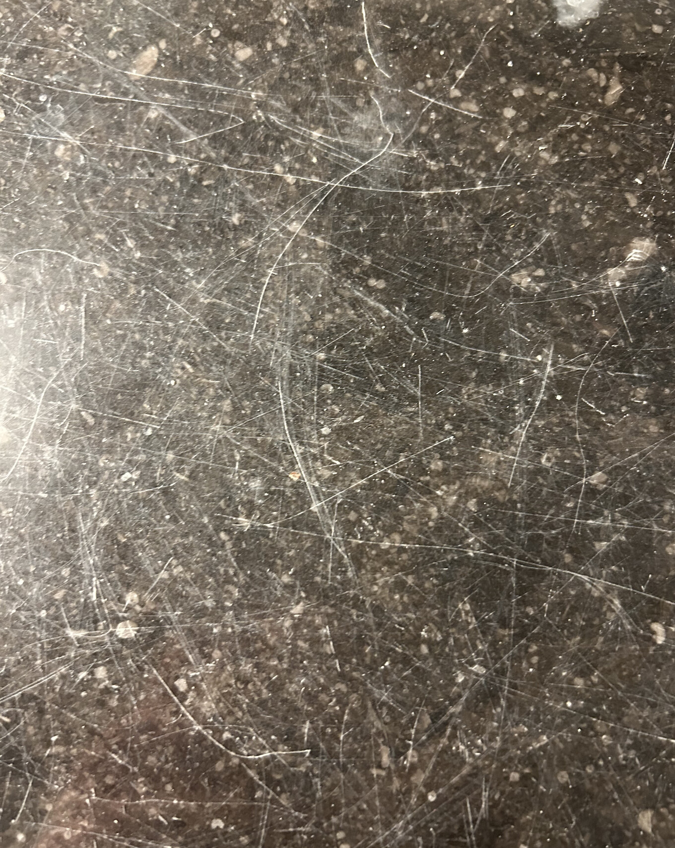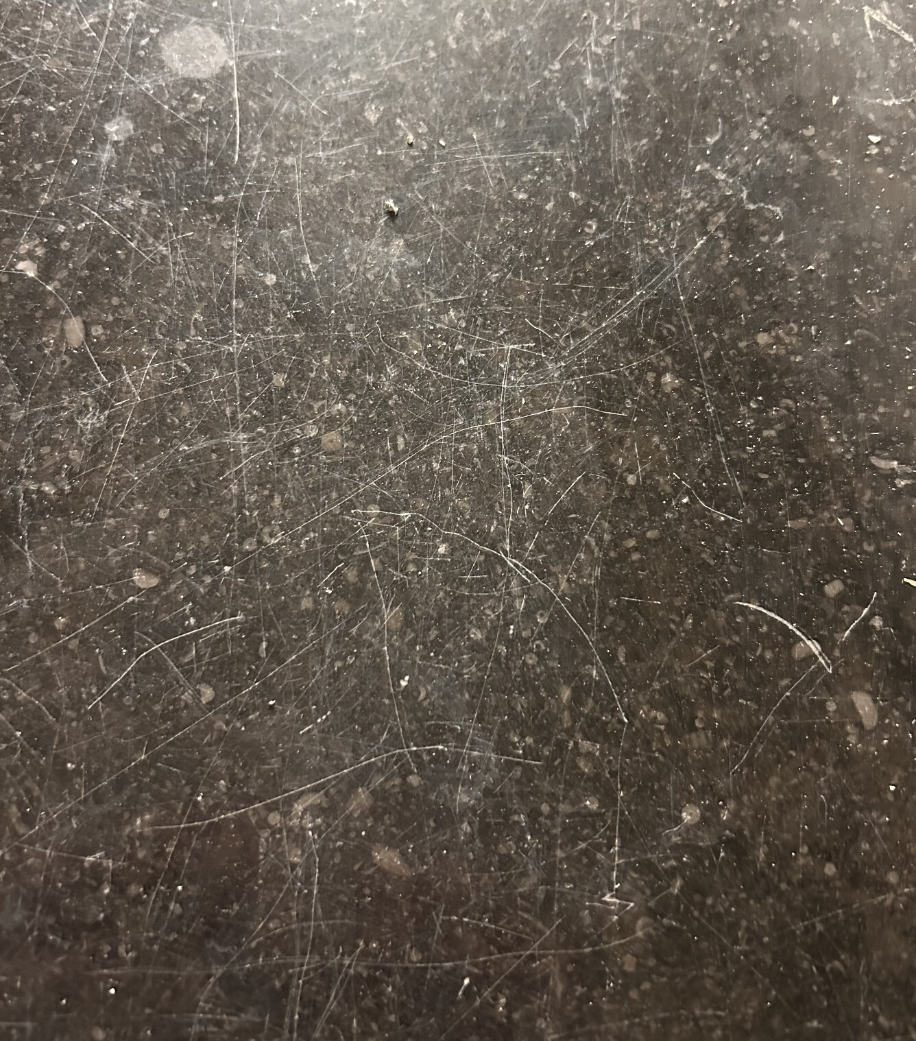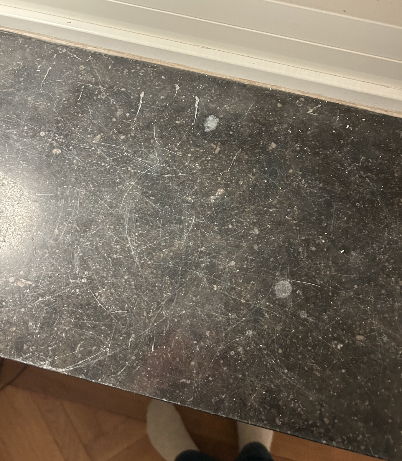 Jag är ingen expert, men jag misstänker att det är någon sorts mörk kalksten. De har en hel del repor och en matt yta, så jag funderar på om det går att polera upp dem igen eller om det krävs något mer omfattande ingrepp.