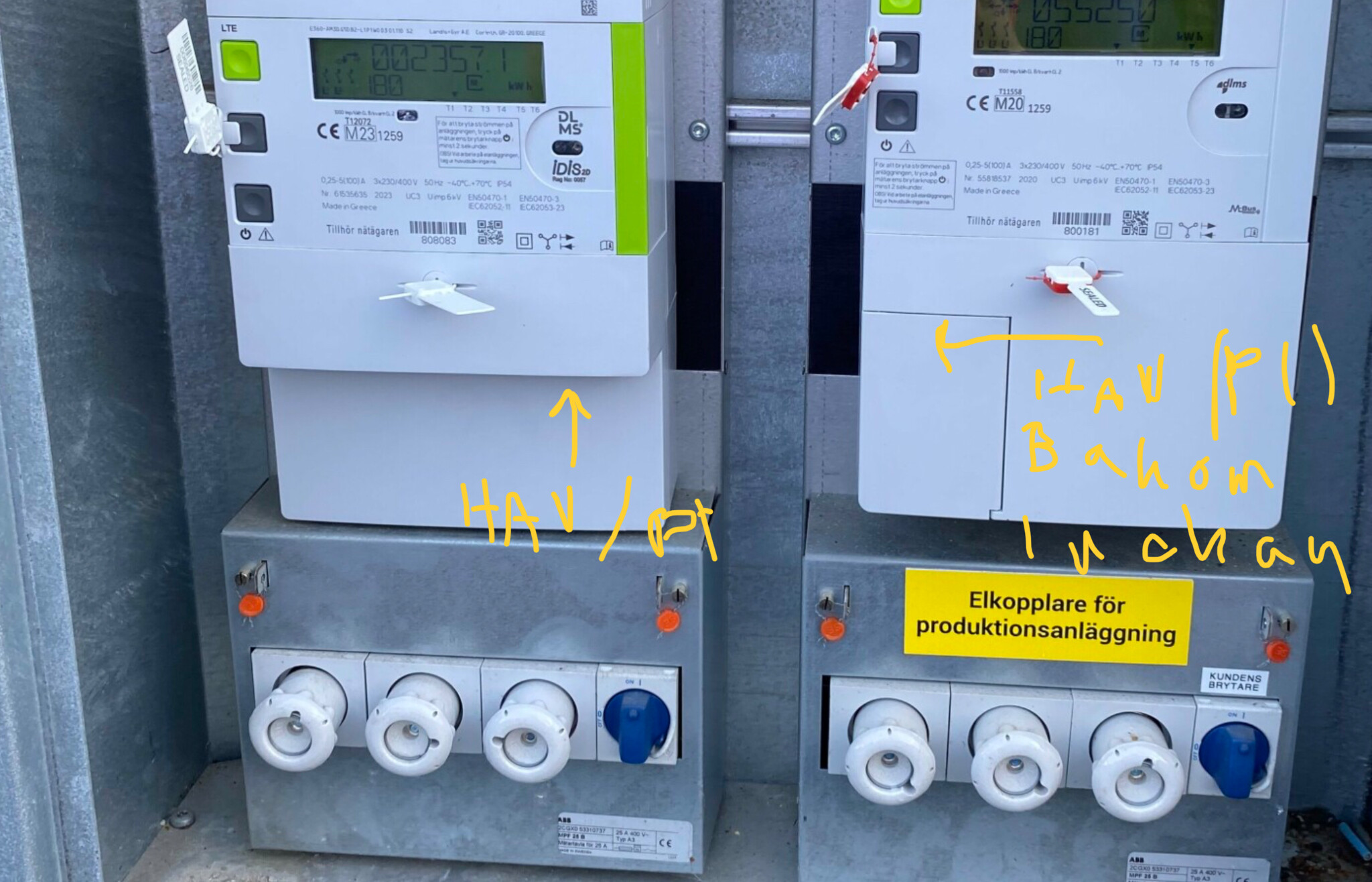 HAN (P1) porten borde sitta under kanten på den vänstra elmätaren och bakom luckan på den högra.