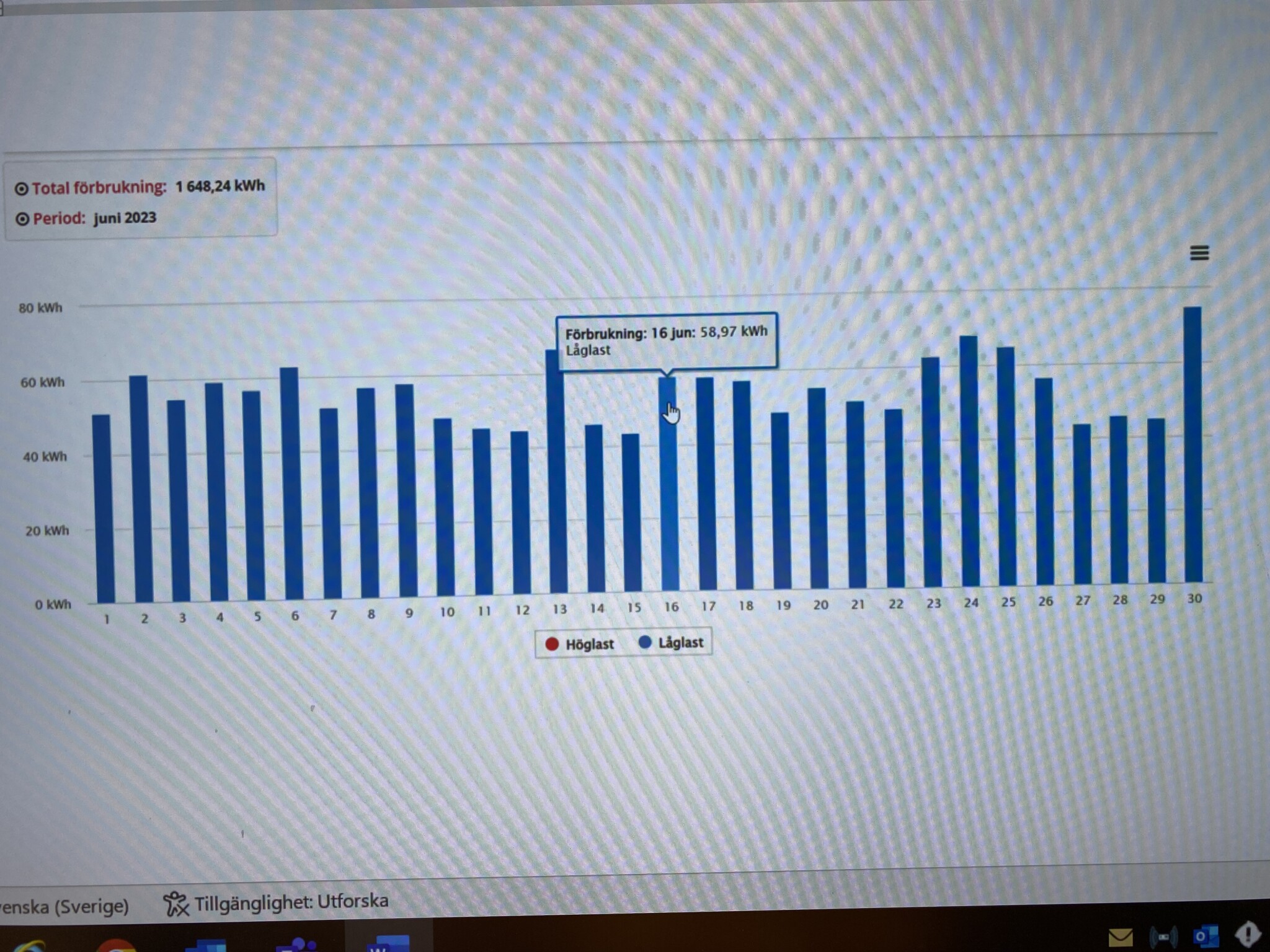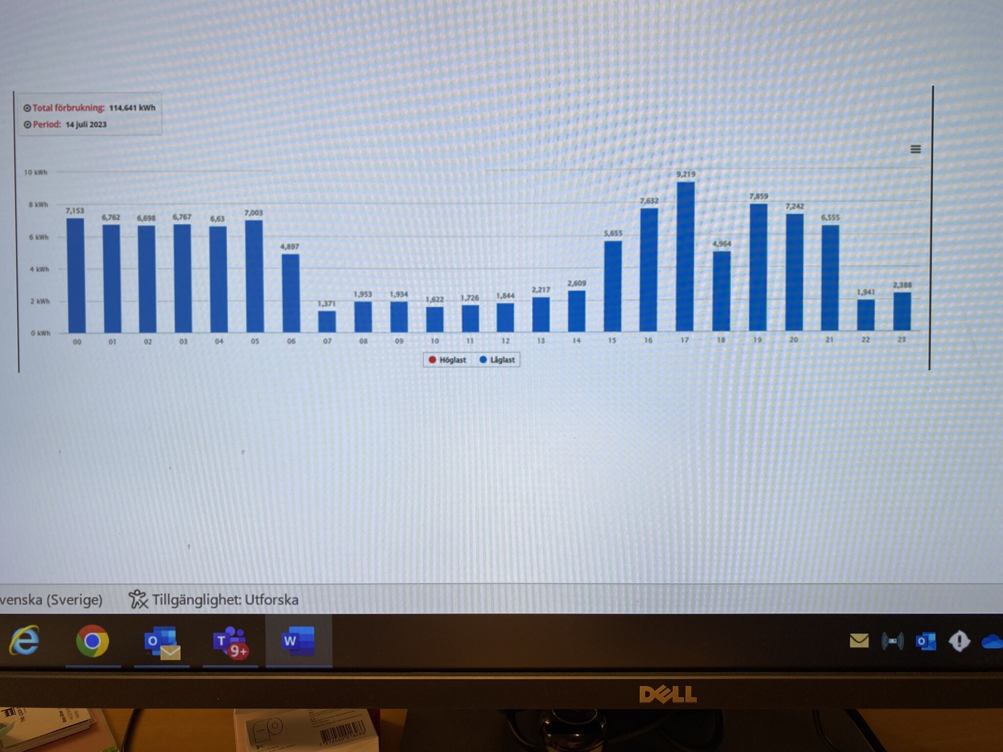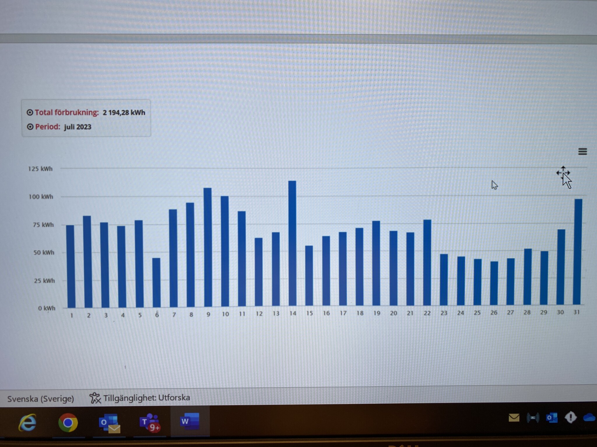 Här är tre bilder dessvärre kass kvalitet men läsbara. Ska komplettera med bild på mätaren. Juni totalt 1 648 kWh. Juli totalt 2 194 kwh. 14 juli i detalj (115 kWh). OBS de ”höga” staplarna är när bilen laddas så det finns en bra förklaring. Dock ligger förbrukningen högt även övriga tider. Enligt tidigare input kan det vara så att min poolpump kanske tar 4-500 kwh (!) per månad, så den provar jag stänga av….sen har jag satt en lägsta framledningstemperatur på vattnet till golvvärmen i källarplan och det kan vara en bov. Min utedel VP går knappt 4h/dygn.