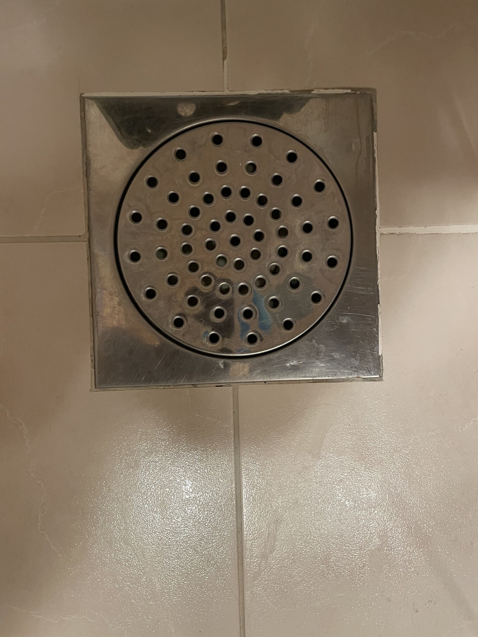 Badrummet är omgjort av föregående ägare 2005. Man kaklade då badrummet, samt lade vattenburen golvvärme. Som vi förstår använde man befintlig plastmatta/våtrumsmatta som underlag (ålder okänd, säkert 30-40 år). Golvvärmen fungerar, kaklet är fräscht, jag har ingen lust att göra om hela badrummet ännu. I samband med besiktning 2017 då vi flyttade in anmärktes att golvbrunnen utgör en riskkonstruktion.