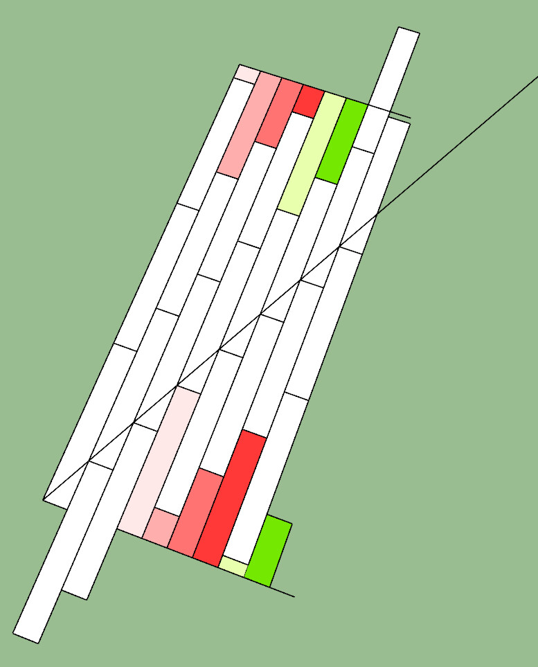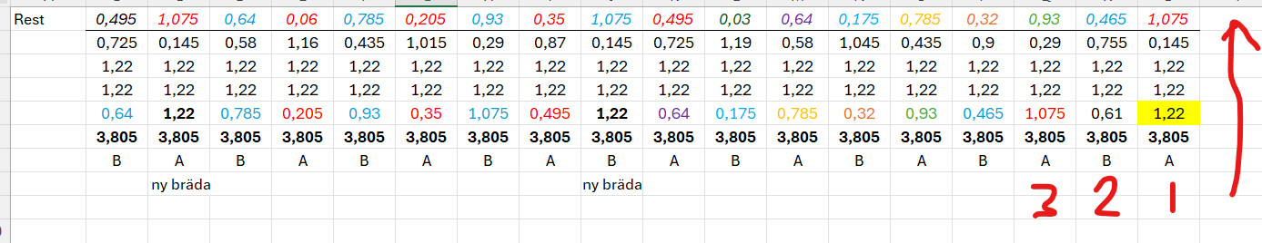 Alternativ B är att jag kapar första brädan så att slutbiten istället blir på 0,365 meter men kan inte använda hela restbiten för då skulle skarven komma nära första raden så får kapa den med. Det blir ju mycket spill - men detta är kanske enda sättet man kan göra eller har jag missat något?