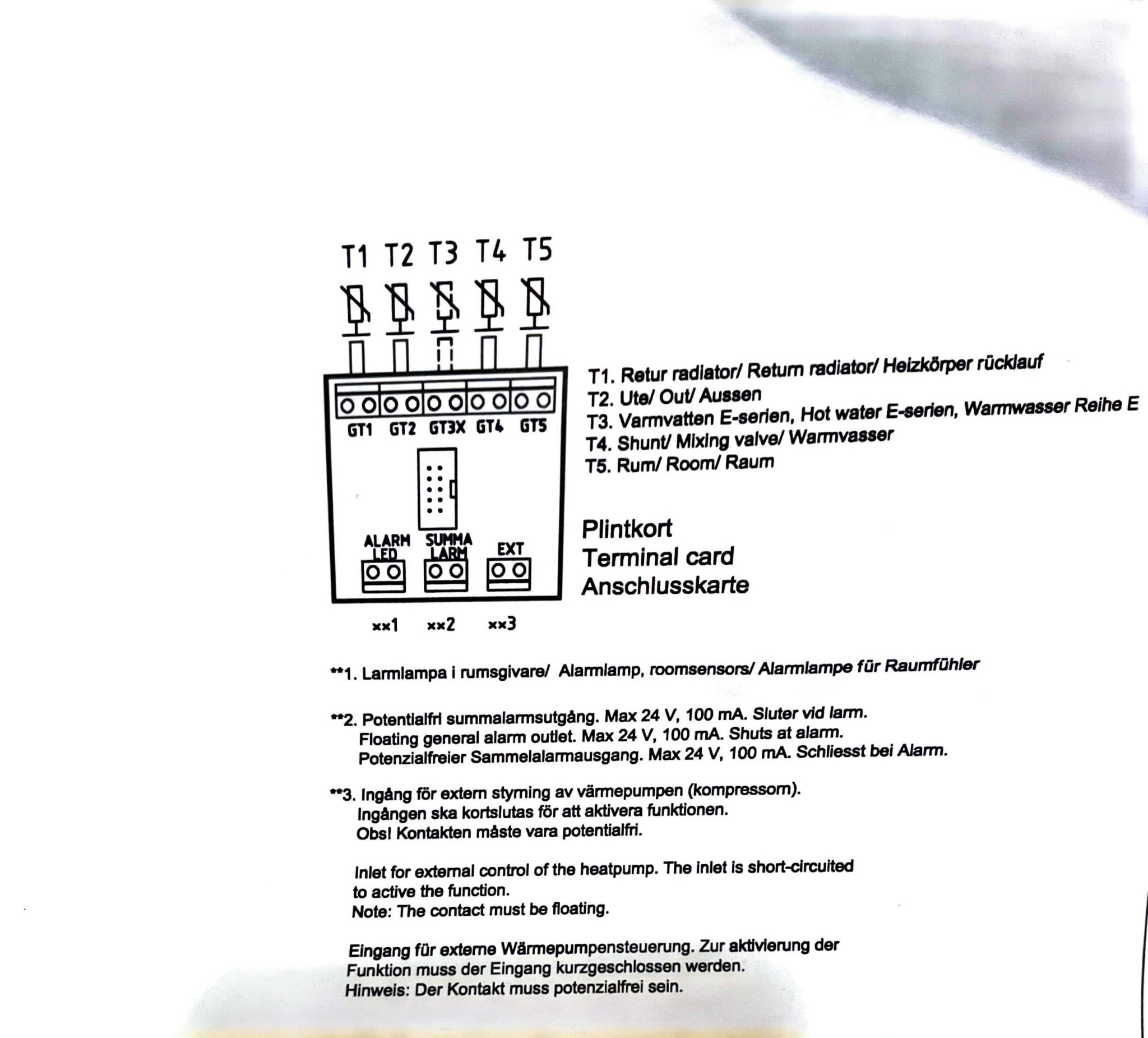 Har en bergvärmepump från 2007 IVT Greenline HT plus. Hur/vad kopplar jag in så att jag får ett larm till mobilen. Har en Homey Pro och kör en del både Fibaro och Nexa. Vilken typ av enhet kan jag använda till detta? Finns en färdig potenialfri larmutgång enligt bild nedan. Har ”flyttat” tillskottet (9 kW) i menyn så långt bort det går men om en inkommande fas i säkringsskåpet av någon anledning slår ifrån så slår ju tillskottet på i alla fall.
