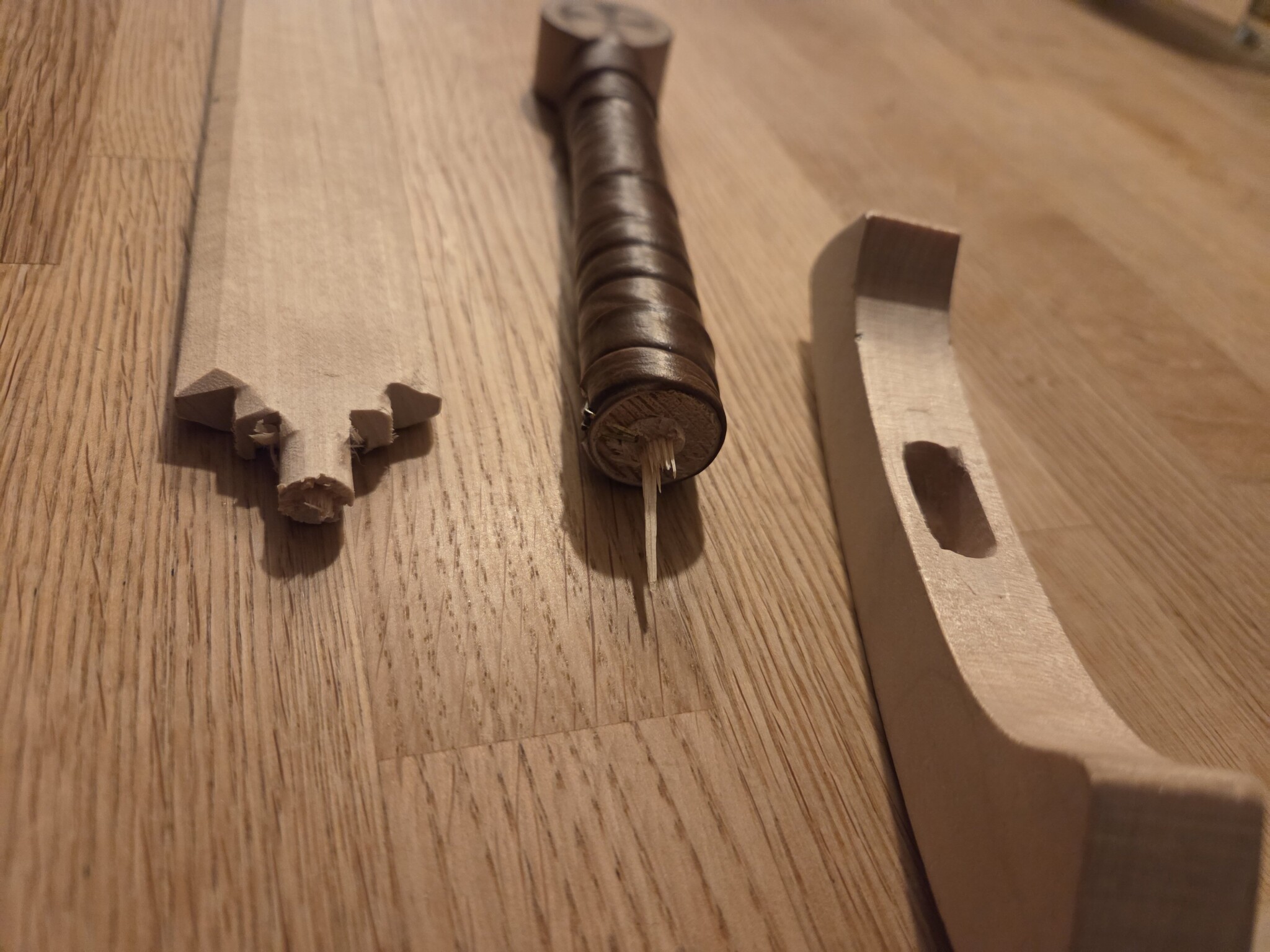 Jag har funderat på att skarva med en ny bit trä och borra ur i båda delarna, men det blir ju inte så mycket material kvar i det eventuella hålet i svärdet.