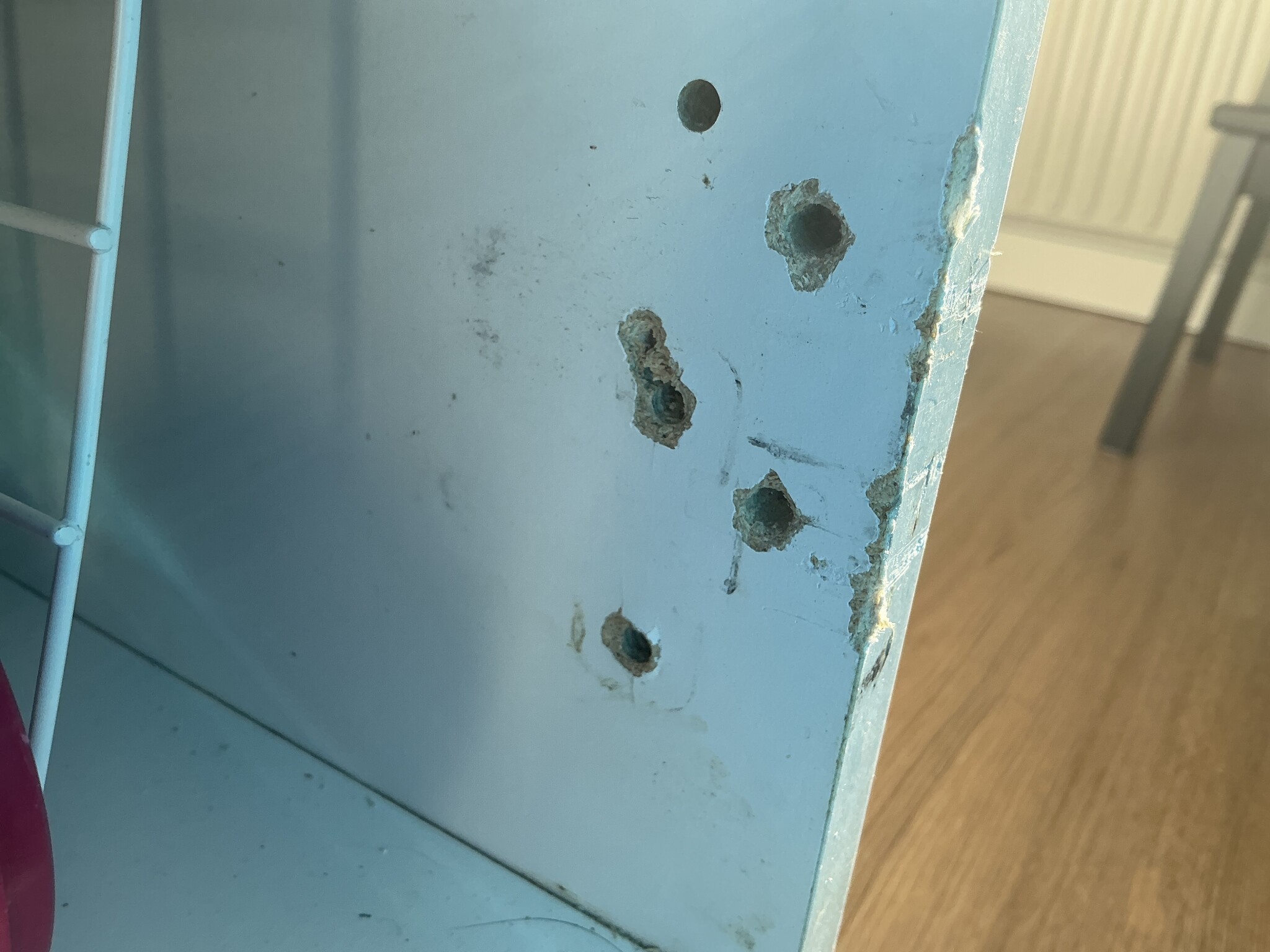 Jag har ett äldre möbel med spånskivesidor där flera skruvhål har blivit uttöjda eller trasiga (se bild nedan). Vissa hål har gått sönder rejält i kanten och skruvarna fäster inte längre.