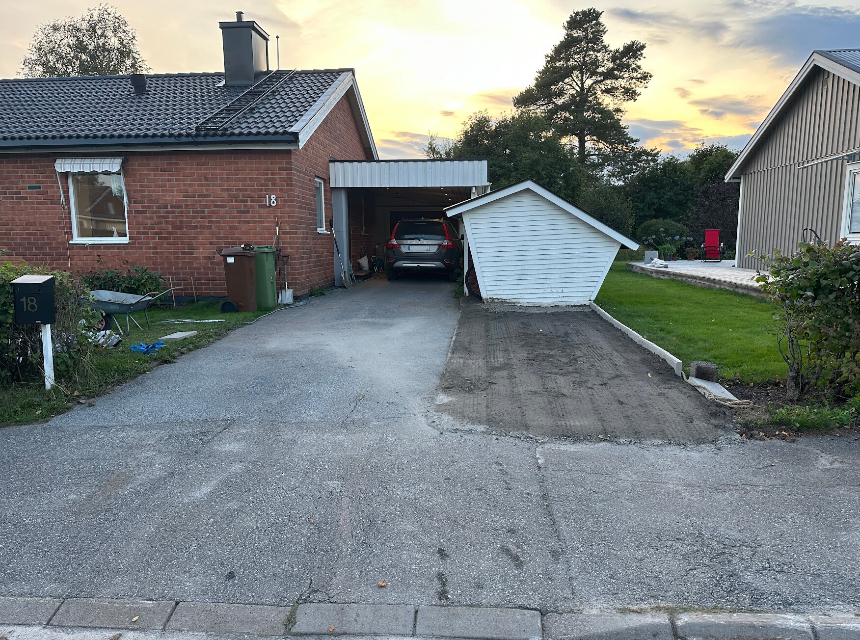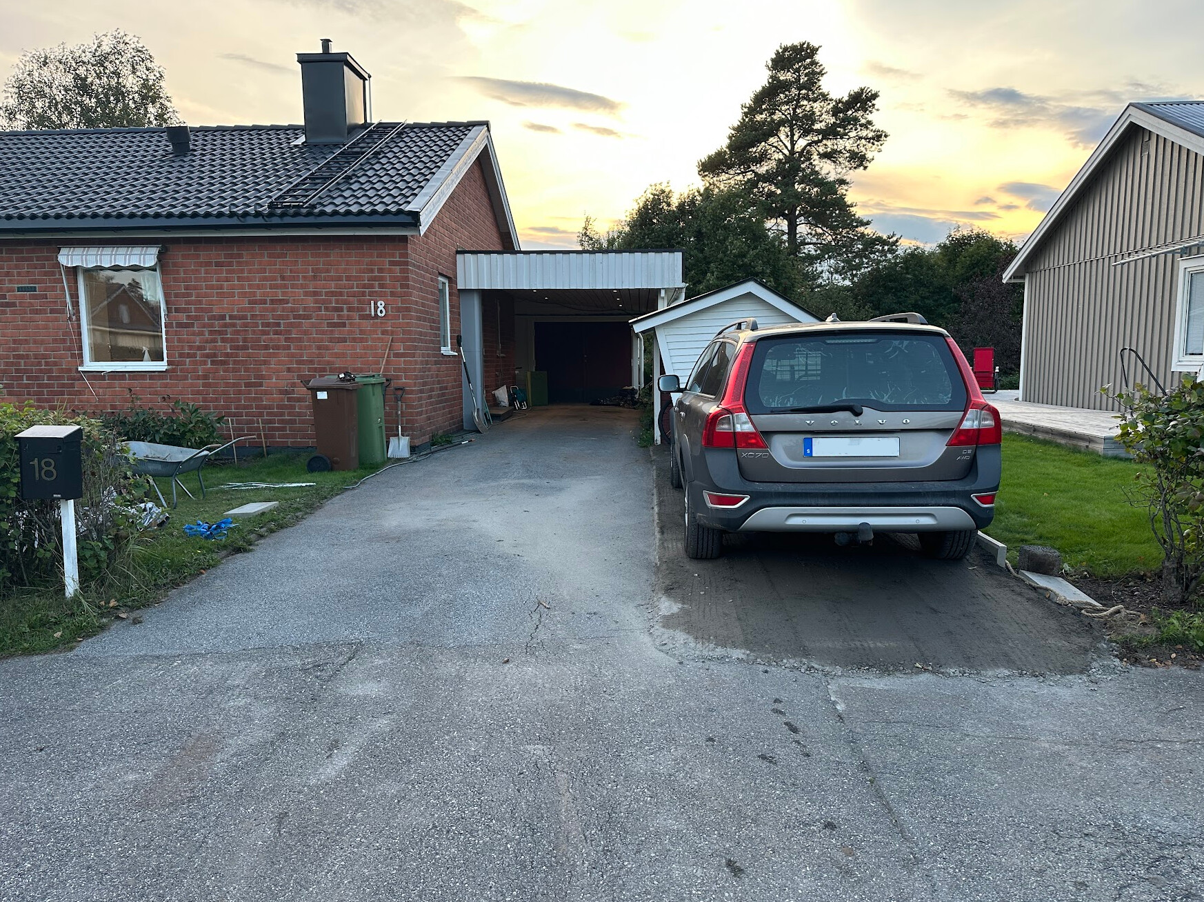 Vår uppfart är idag för smal för att ha två bilar bredvid varandra vilket har gjort att vi har andrabilen som används sällan i vår carport och förstabilen bakom/framför den. Det innebär dels att vi måste flytta ut förstabilen för att komma ut med andrabilen och dels att förstabilen måste stökas av under varje dag hela vintern och vi drar ingen riktig nytta av carporten.