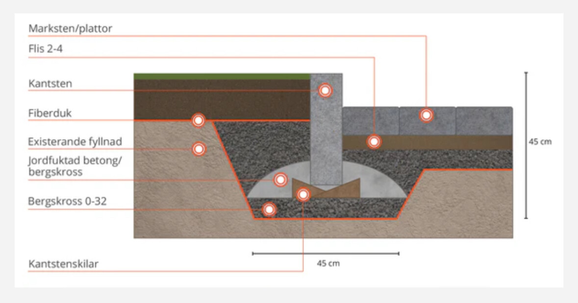 OK, jag tänkte återkomma med lite resultat men även önskan om nya råd. Mitt val av kantsten blev inte så bra då jag inte kunde få ner den nog långt ner i jorden (kom bara 10cm ner innan det var stora stenar på sina håll och kantstenarna är 25cm så större delen ovan jord), så när krosset packas och rör sig mot kantstenen så rör sig som förväntat stenarna snett utåt.