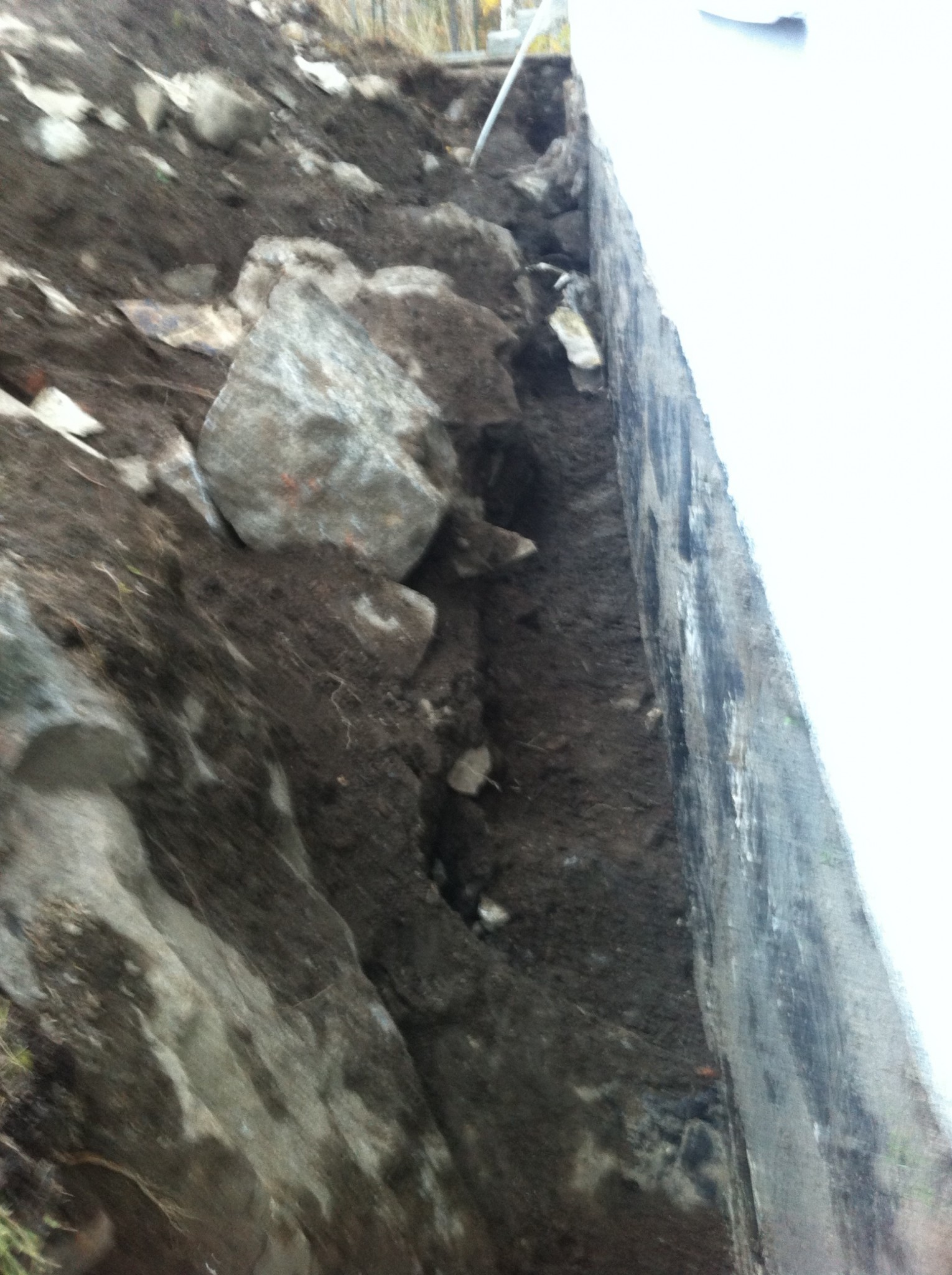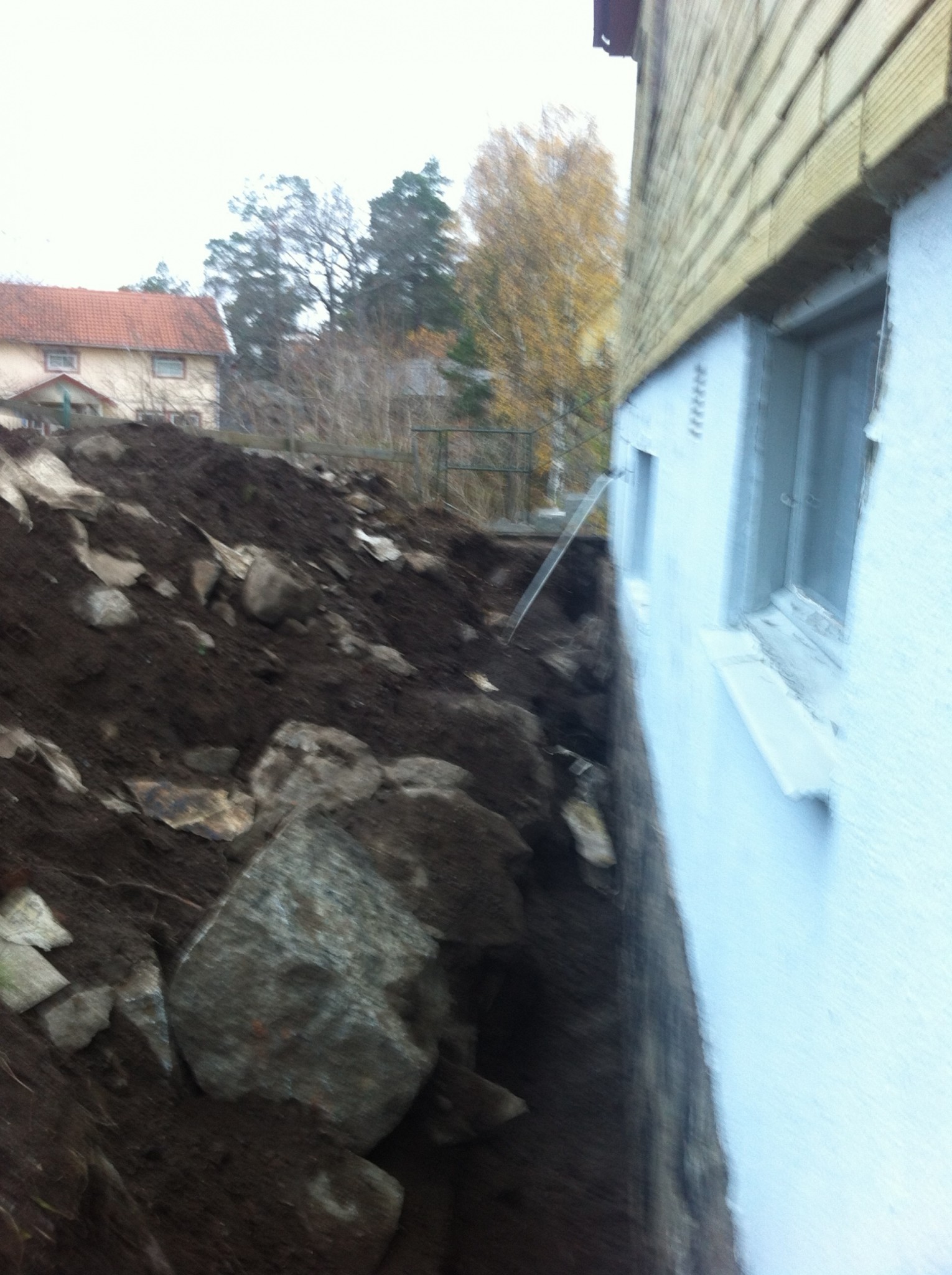 Till saken hör att vi inte haft några egentliga fuktproblem. Jag beslutade dock för att jag ville dränera om innan vi gjorde om fasaden. Nu har jag grävt ca 80% av de två sidorna vi vill dränera och funnit följande, huset är sedan tidigare ordentligt behandlat med kallasfalt (det är troligtvis därför vi ej haft problem). Husets grund ligger till stor del i en utsprängd ficka i bärget (ca 20 cm från bergskanten) tack vare detta bildas det stora v-formade sprickor som går tvärs mot grunden där jag aldrig kommer få ut vatten genom en dränering. I dagsläget är även dessa sprickor behandlade med kallasfalt.