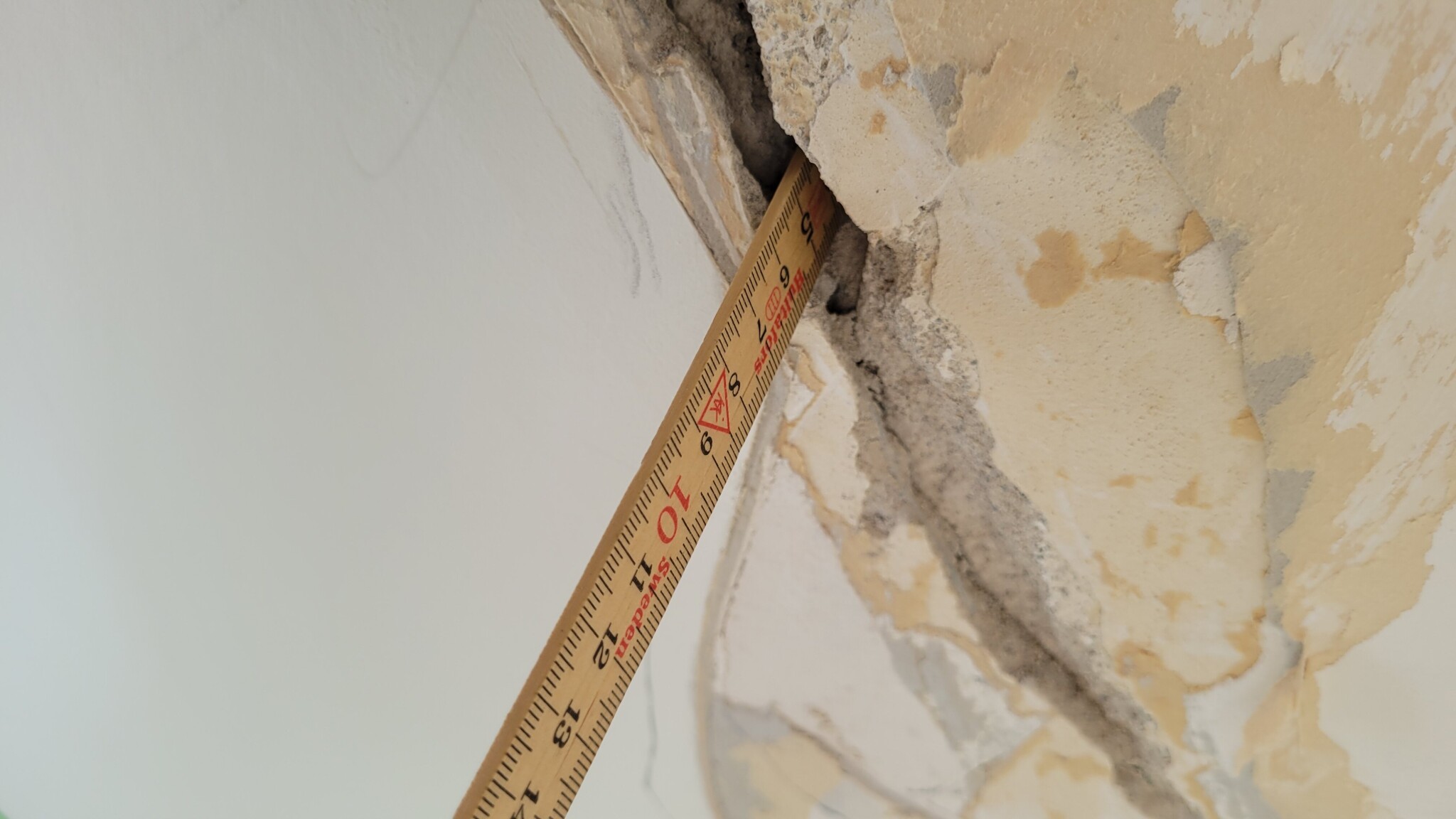 Vi hittade en spricka i tapeten. Efter att ha pillat visade det sig vara spricka i underliggande betongvägg. Jag försöker förstå vad jag ser och funderar på om det varit bristande överlapp av armering som är orsaken till sprickan