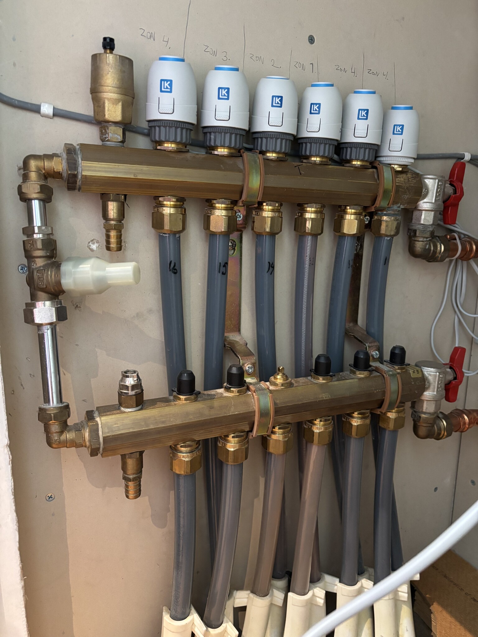 Är röret ( baypass ) till vänster varmt, det sitter en ventil där under det vita, den ska du stänga, men räkna varven som du vrider och ta foto, den ska tillbaka i samma läge sen. Sen stänger ner alla termostater till noll utom i ett rum, finns det luft och du har tur så åker det ur slingan. Automatluftaren på topp ska du ta bort den svarta hatten på. Efter någon halv timma, så sätter du upp tempen i nästa rum och stänger ner i det första rummet o.s.v Det gäller att få fart på flödet i varje slinga, så luft kan åka med ut, den hamnar då i värmekällan, men kan komma tillbaka, då brukar det liksom knastra i fördelaren där. Nu är alla slingor öppna, det syns på markeringen på donen, markeringen blå ska vara borta, nere i donet för stängda. När du är färdig, så skruvas baypassventilen till förutvarande läge och och hatten på avluftaren sätts tillbaka, den typen ska vara stängd normalt och bara öppnas någon gång, kanske varannan månad. Det är så att dom har en tendens till att börja läcka om dom är öppna jämt.