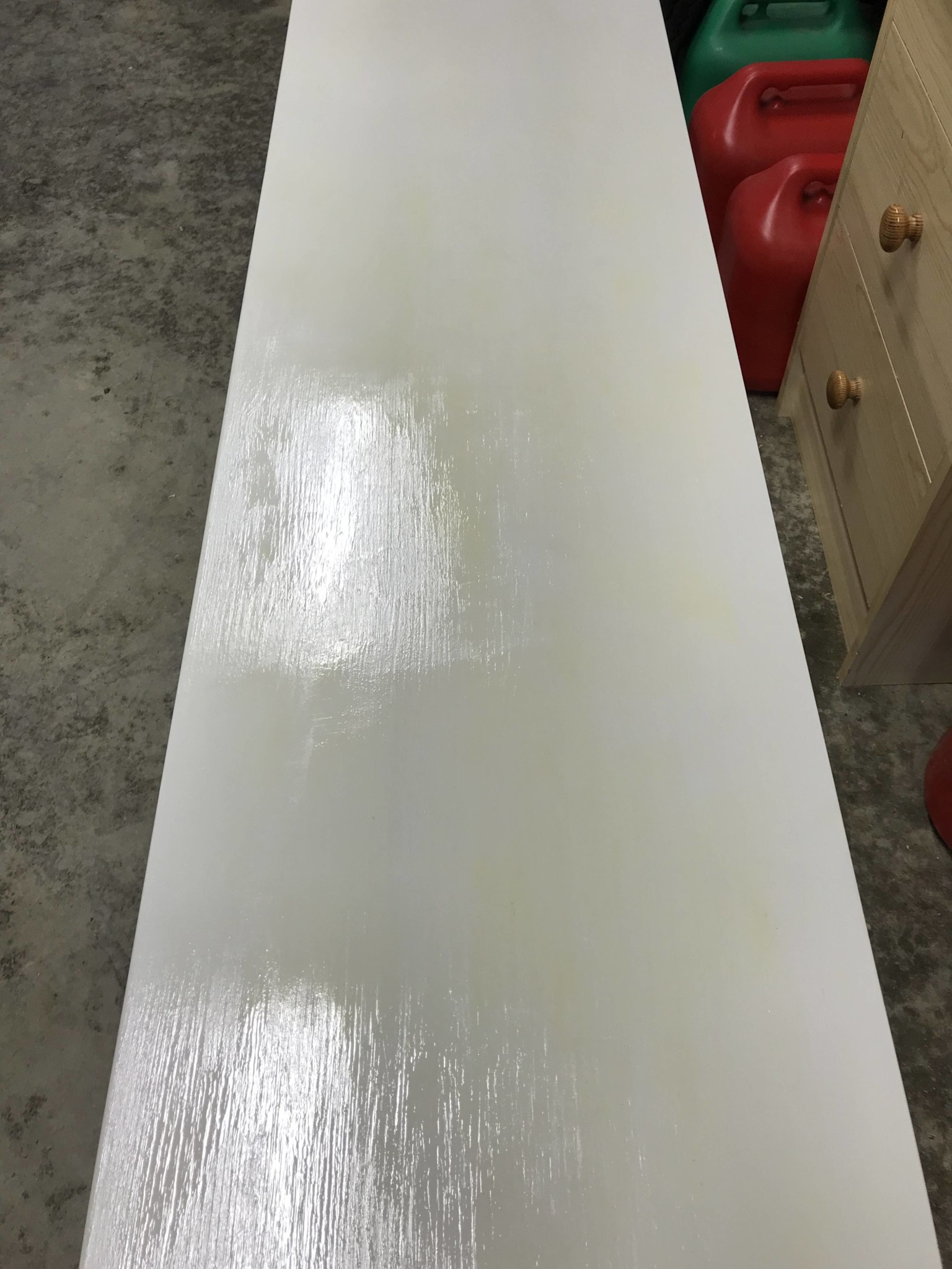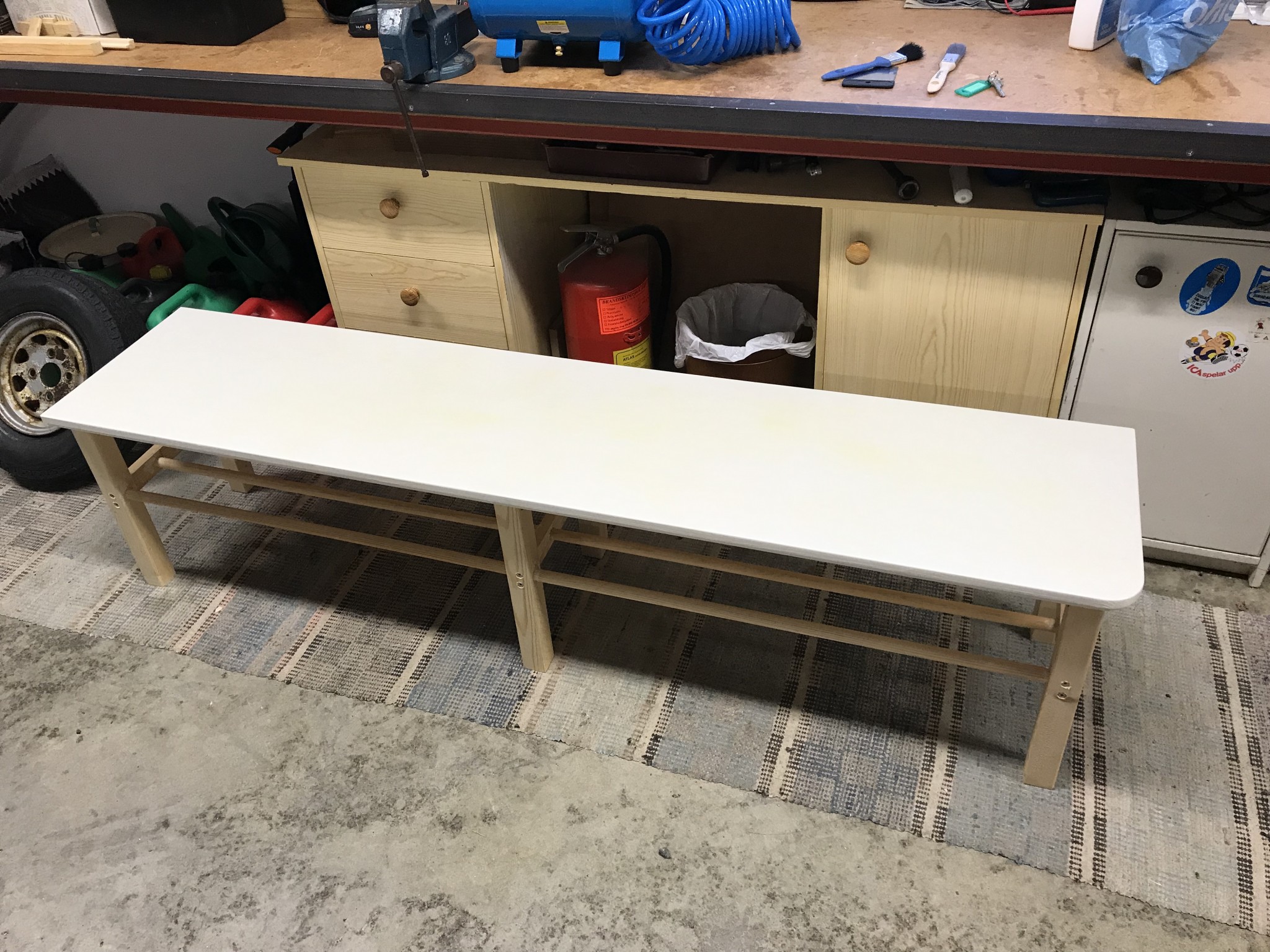 Jag har gjort en platsbyggd sittbänk till hallen som jag målat med Beckers lackfärg (antikvit) och sedan med Tre Stjerner Golvlack för att utan skulle bli lite tåligare. Tyvärr var golvlacken gammal och ytan blev gulflammig.