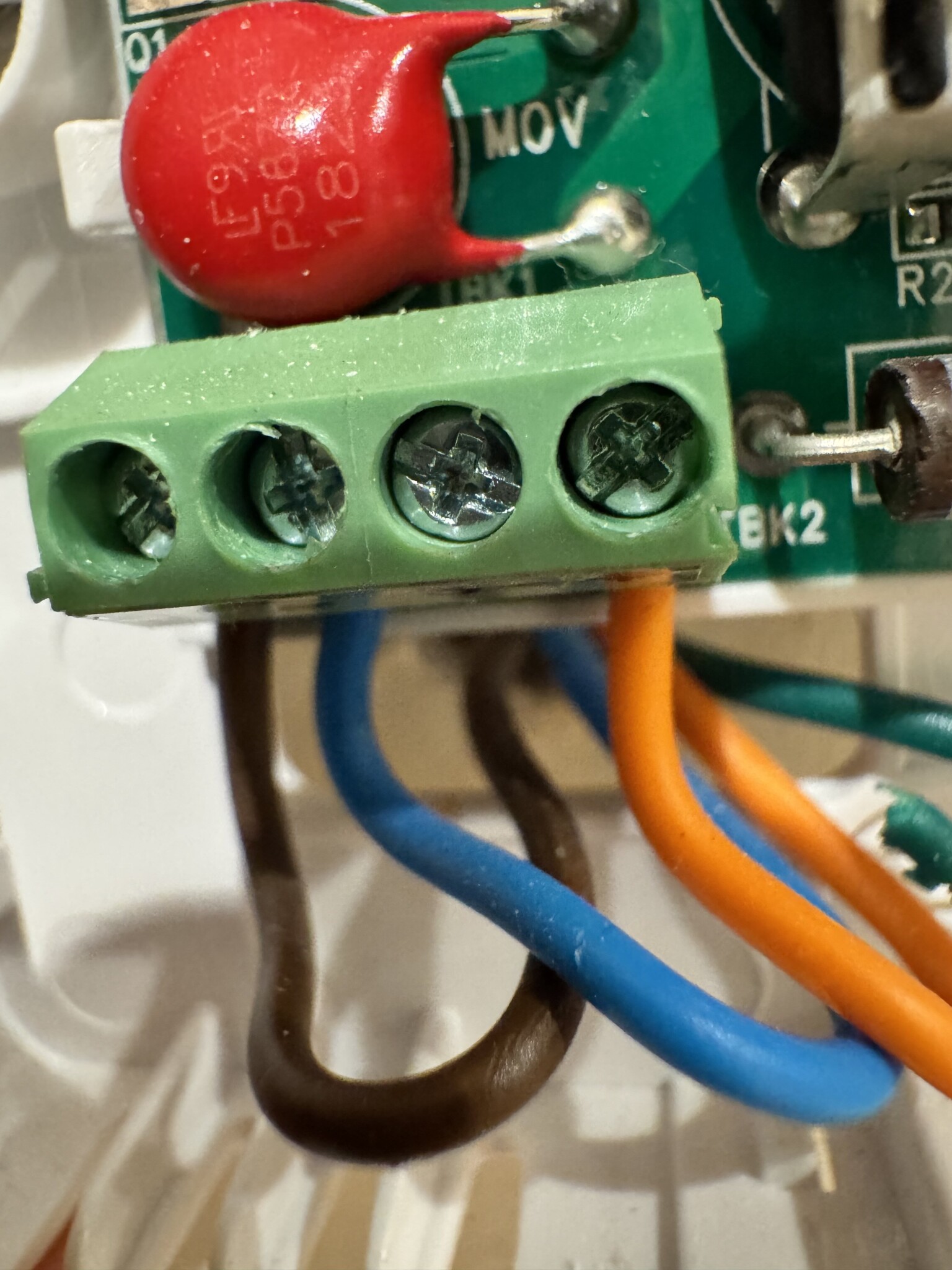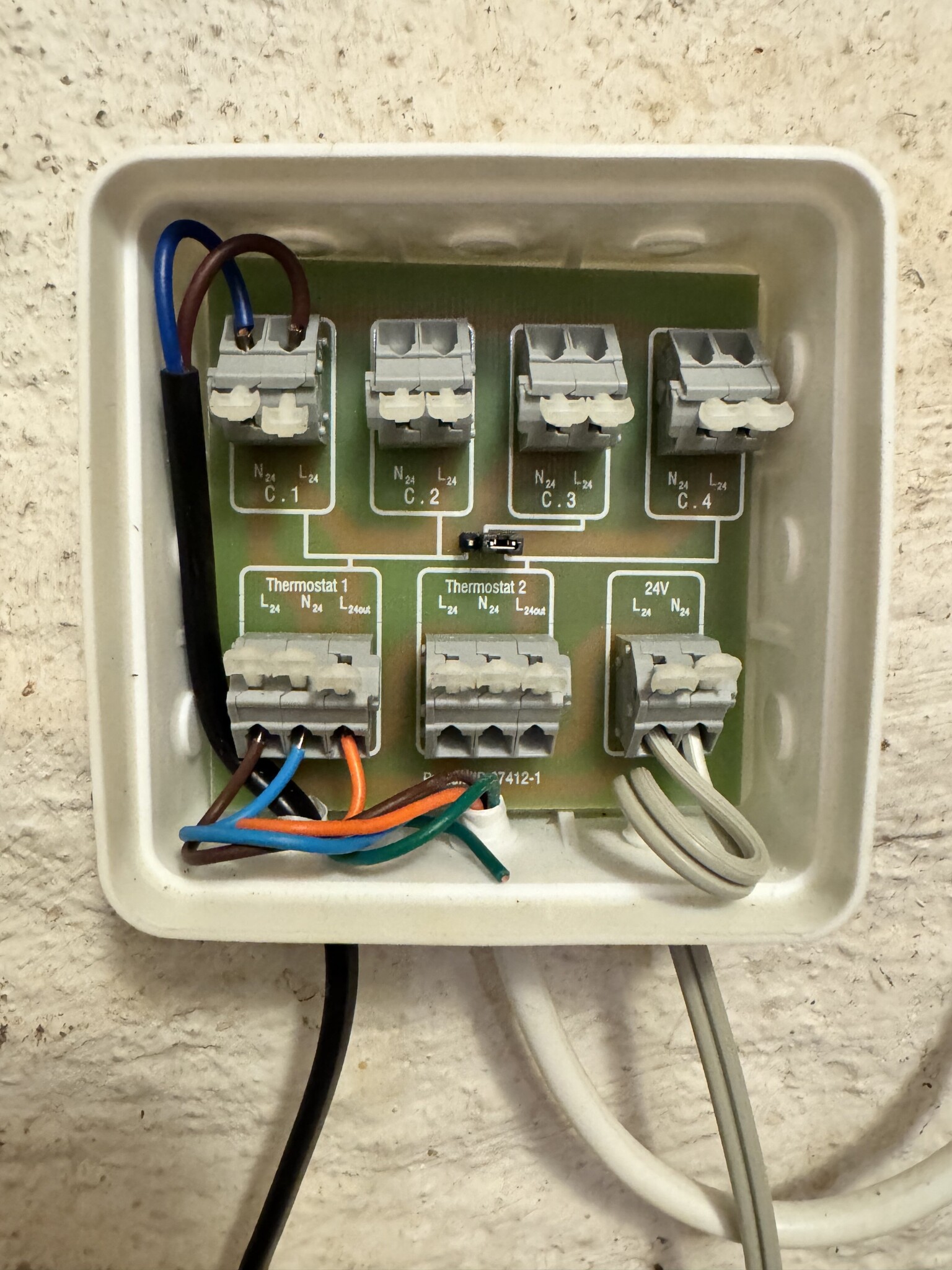 Brun och Blå är 24 V matning till bef. termostat, bef. termostat lägger ut 24 V på L24out