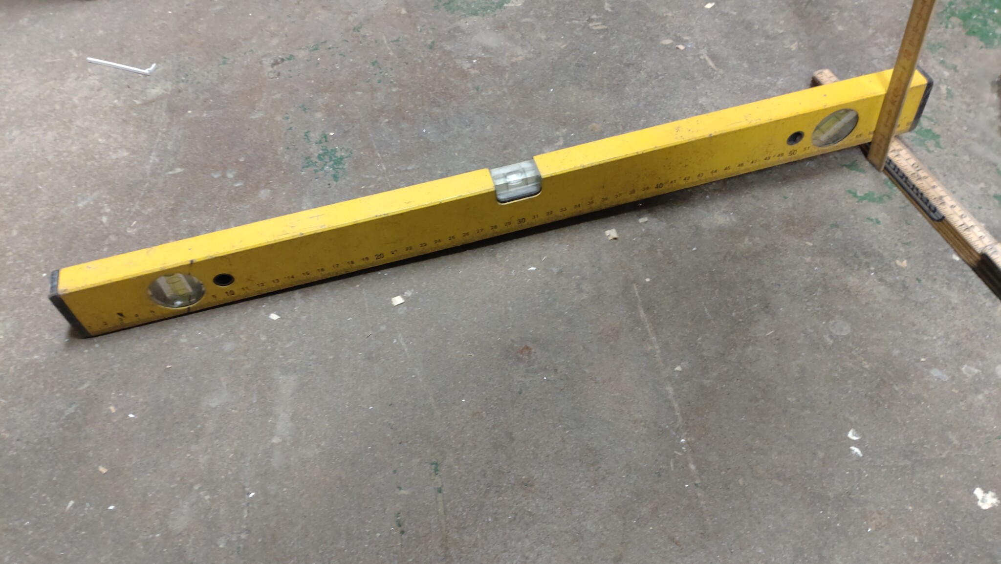 Hej! Jag tog en bild på fallet i mitt garage. Här har jag pallat upp mitt billiga (och ev dåliga) vattenpass tills bubblan är i mitten (i våg). Jag mäter hur högt jag behövde palla (shimsa) och det är då mitt fall, ca 15mm över 55cm. För att minska felmarginalen eftersom vattenpasset är dåligt vänder jag även en gång för att se om bubblan är i mitten även då.