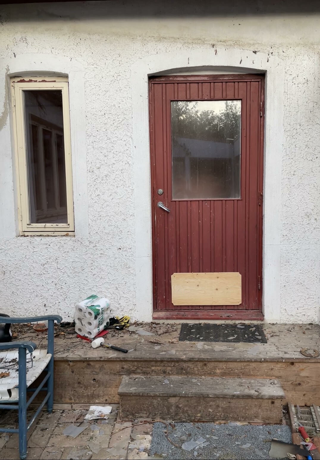 Trätrappan till ytterdörren håller på att ruttna bort, och vi har bestämt oss för att vi vill ha en tegeltrappa istället, idag ligger det nämligen tegel på uteplatsen som trappan går ner till. Trappen kommer troligen bli två steg hög, och tänker mig att översta steget blir en knapp meter djupt och en dryg meter brett.