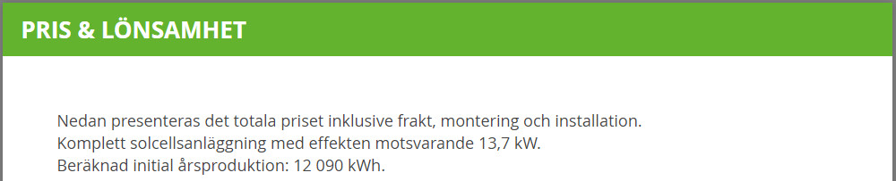 Jag fick kalkyl på 12 000 kwh/år och det blev 12 600 och då kopplade jag in dom 23/2 dvs inte ett fullt år. Så det stämmer nog ganska bra det du får i en offert. Ingen vet hur mycket solen lyser, men dom kör på statistik nov-jan ger i stort sett inget. Med en offert (du får det gratis via nätet) så får du nog det svar du vill ha, dom räknar ut ifrån estimerad årsförbrukning som du ger dom. Nedan ser du min verklighet Lycka till