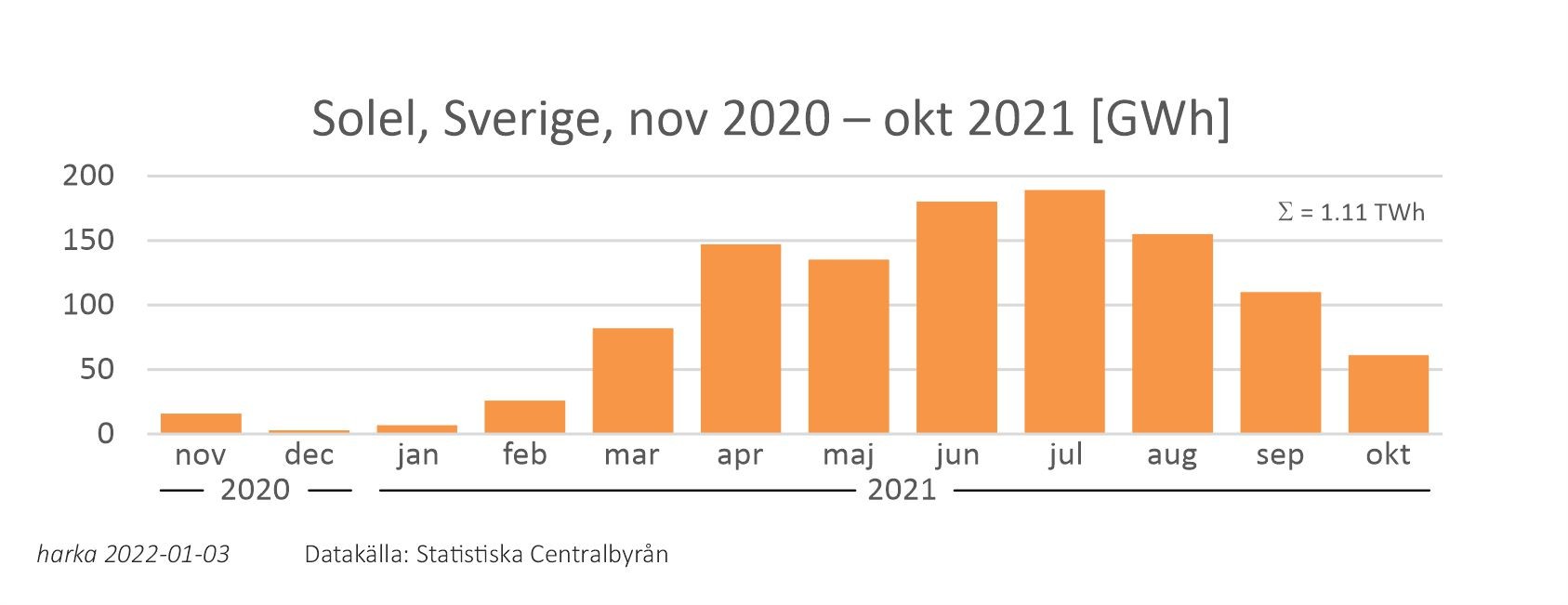 bifogar en graf över solkraftproduktionen i Sverige de senaste 12 månaderna (för vilka det finns officiell statistik från SCB):
