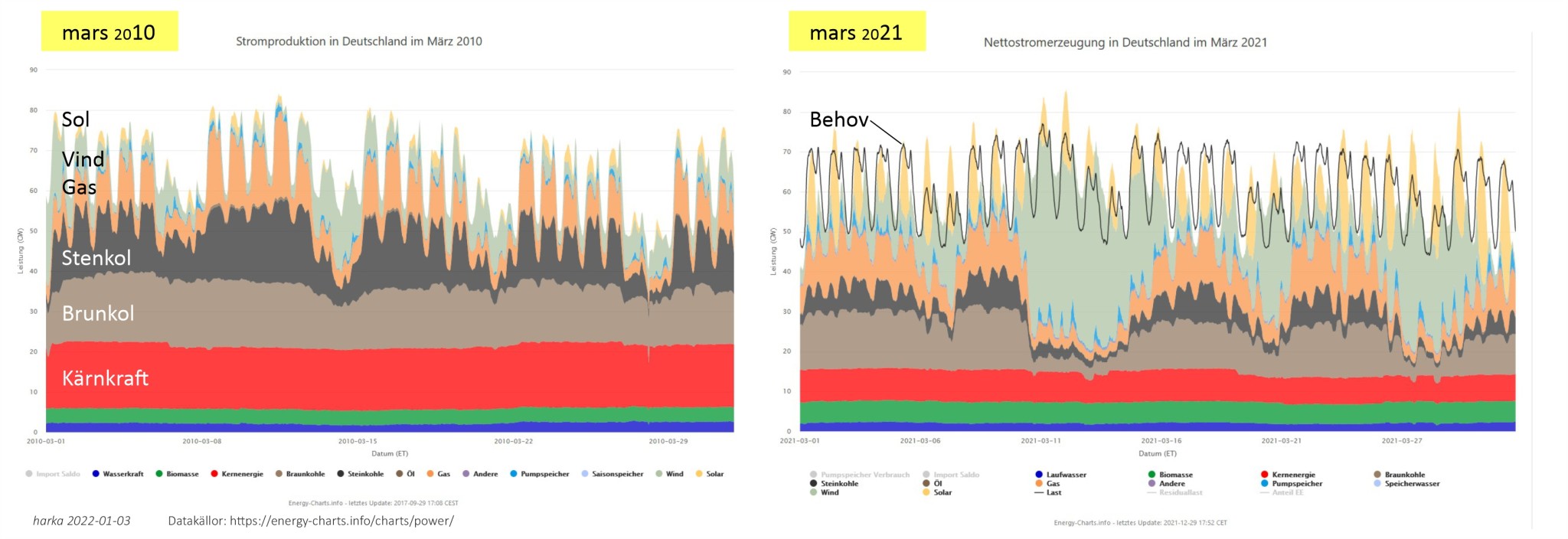 för mars 2021 ser det rent optiskt ut som att solen stiger upp och möter upp med en avsevärd stöttning under energitoppen dagtid (fluktuationen mellan natt och dag) – tidigare hanterade man det med att dra upp farten på kol- och gaspannorna, numera ligger dessa fossila energibärare mera som en låg basgenerator (och dras ner ytterligare när det friskar i och vindkraftverken ökar sin produktion)